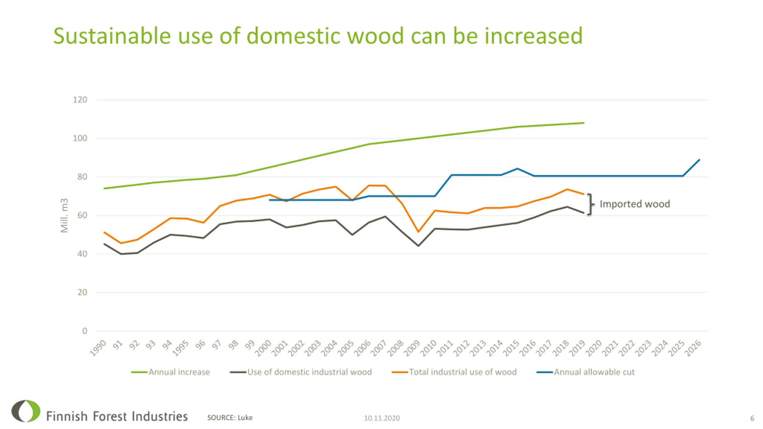 The growth of Finnish forests is over 100 mill. m3per year 120 Annual growth Total drain Industrial roundwood 100 80 Mill. m3 60 40 20 0 1960 1965 1970 1975 1980 1985 1990 1995 2000 2005 2010 2015 2020 SOURCE: Luke 3.3.2021 5