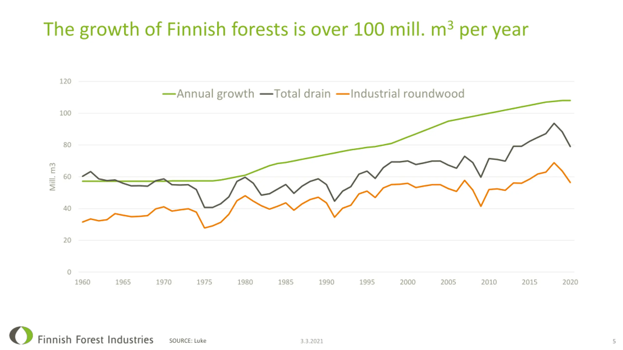 Forest resources grow all the time 3000 Pine Spruce Deciduous 2500 2000 Mill. m3 1500 1000 500 0 1921-24 36-38 1944 51-53 60-63 64-70 71-76 77-84 86-94 96-2003 2009-13 2014-19 SOURCE: Luke 10.11.2020 4