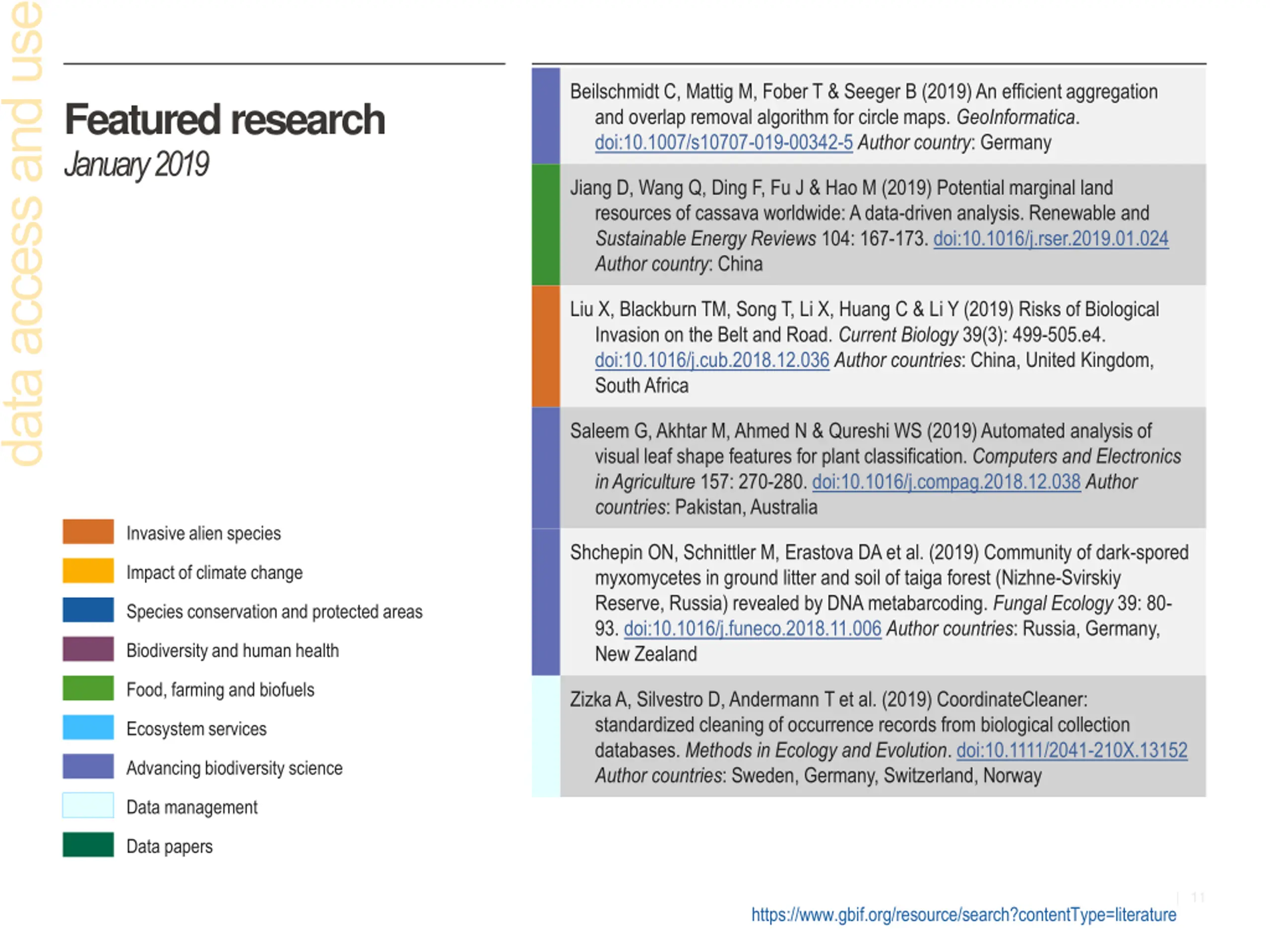 Beilschmidt C, Mattig M, Fober T & Seeger B (2019) An efficient aggregation and overlap removal algorithm for circle maps. GeoInformatica. doi:10.1007/s10707-019-00342-5 Author country: Germany Featured research January 2019 Jiang D, Wang Q, Ding F, Fu J & Hao M (2019) Potential marginal land resources of cassava worldwide: A data-driven analysis. Renewable and Sustainable Energy Reviews 104: 167-173. doi:10.1016/j.rser.2019.01.024 Author country: China Liu X, Blackburn TM, Song T, Li X, Huang C & Li Y (2019) Risks of Biological Invasion on the Belt and Road. Current Biology 39(3): 499-505.e4. doi:10.1016/j.cub.2018.12.036 Author countries: China, United Kingdom, South Africa Saleem G, Akhtar M, Ahmed N & Qureshi WS (2019) Automated analysis of visual leaf shape features for plant classification. Computers and Electronics in Agriculture 157: 270-280. doi:10.1016/j.compag.2018.12.038 Author countries: Pakistan, Australia Invasive alien species Shchepin ON, Schnittler M, Erastova DA et al. (2019) Community of dark-spored myxomycetes in ground litter and soil of taiga forest (Nizhne-Svirskiy Reserve, Russia) revealed by DNA metabarcoding. Fungal Ecology 39: 80- 93. doi:10.1016/j.funeco.2018.11.006 Author countries: Russia, Germany, New Zealand Impact of climate change Species conservation and protected areas Biodiversity and human health Food, farming and biofuels Zizka A, Silvestro D, Andermann T et al. (2019) CoordinateCleaner: standardized cleaning of occurrence records from biological collection databases. Methods in Ecology and Evolution. doi:10.1111/2041-210X.13152 Author countries: Sweden, Germany, Switzerland, Norway Ecosystem services Advancing biodiversity science Data management Data papers | 11 https://www.gbif.org/resource/search?contentType=literature
