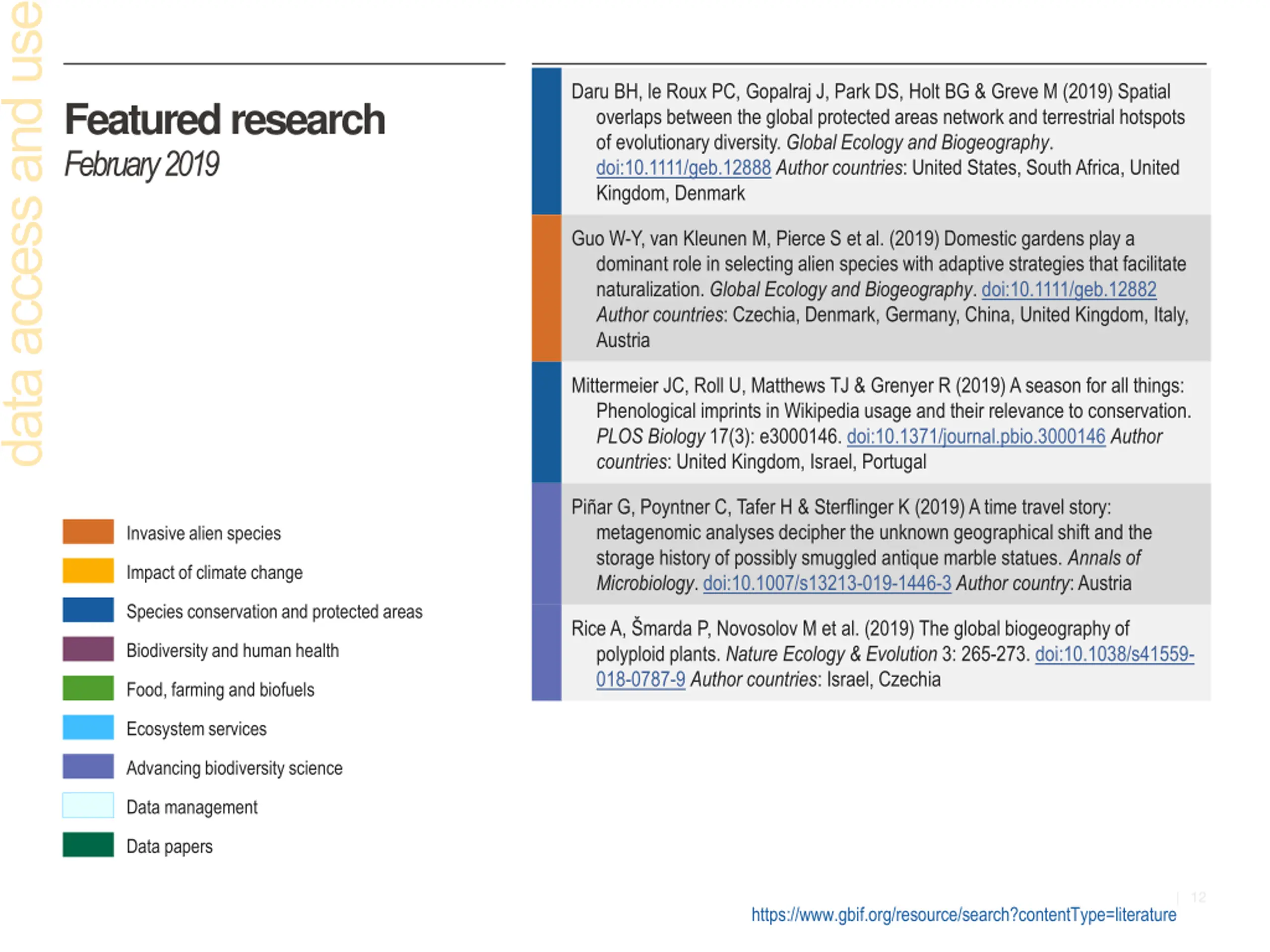 Daru BH, le Roux PC, Gopalraj J, Park DS, Holt BG & Greve M (2019) Spatial overlaps between the global protected areas network and terrestrial hotspots of evolutionary diversity. Global Ecology and Biogeography. doi:10.1111/geb.12888 Author countries: United States, South Africa, United Kingdom, Denmark Featured research February 2019 Guo W-Y, van Kleunen M, Pierce S et al. (2019) Domestic gardens play a dominant role in selecting alien species with adaptive strategies that facilitate naturalization. Global Ecology and Biogeography. doi:10.1111/geb.12882 Author countries: Czechia, Denmark, Germany, China, United Kingdom, Italy, Austria Mittermeier JC, Roll U, Matthews TJ & Grenyer R (2019) A season for all things: Phenological imprints in Wikipedia usage and their relevance to conservation. PLOS Biology 17(3): e3000146. doi:10.1371/journal.pbio.3000146 Author countries: United Kingdom, Israel, Portugal Pi ar G, Poyntner C, Tafer H & Sterflinger K (2019) A time travel story: metagenomic analyses decipher the unknown geographical shift and the storage history of possibly smuggled antique marble statues. Annals of Microbiology. doi:10.1007/s13213-019-1446-3 Author country: Austria Invasive alien species Impact of climate change Species conservation and protected areas Rice A, marda P, Novosolov M et al. (2019) The global biogeography of polyploid plants. Nature Ecology & Evolution 3: 265-273. doi:10.1038/s41559- 018-0787-9 Author countries: Israel, Czechia Biodiversity and human health Food, farming and biofuels Ecosystem services Advancing biodiversity science Data management Data papers | 12 https://www.gbif.org/resource/search?contentType=literature