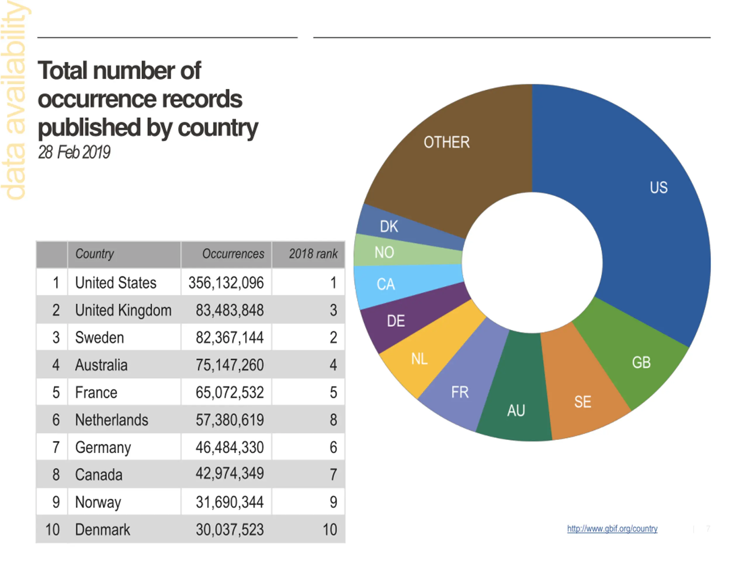 Total number of occurrence records published by country 28 Feb 2019 Country Occurrences 2018 rank 1 United States 356,132,096 1 2 United Kingdom 83,483,848 3 3 Sweden 82,367,144 2 4 Australia 75,147,260 4 5 France 65,072,532 5 6 Netherlands 57,380,619 8 7 Germany 46,484,330 42,974,349 6 8 Canada 7 9 Norway 31,690,344 9 10 Denmark 30,037,523 10 http://www.gbif.org/country | 7