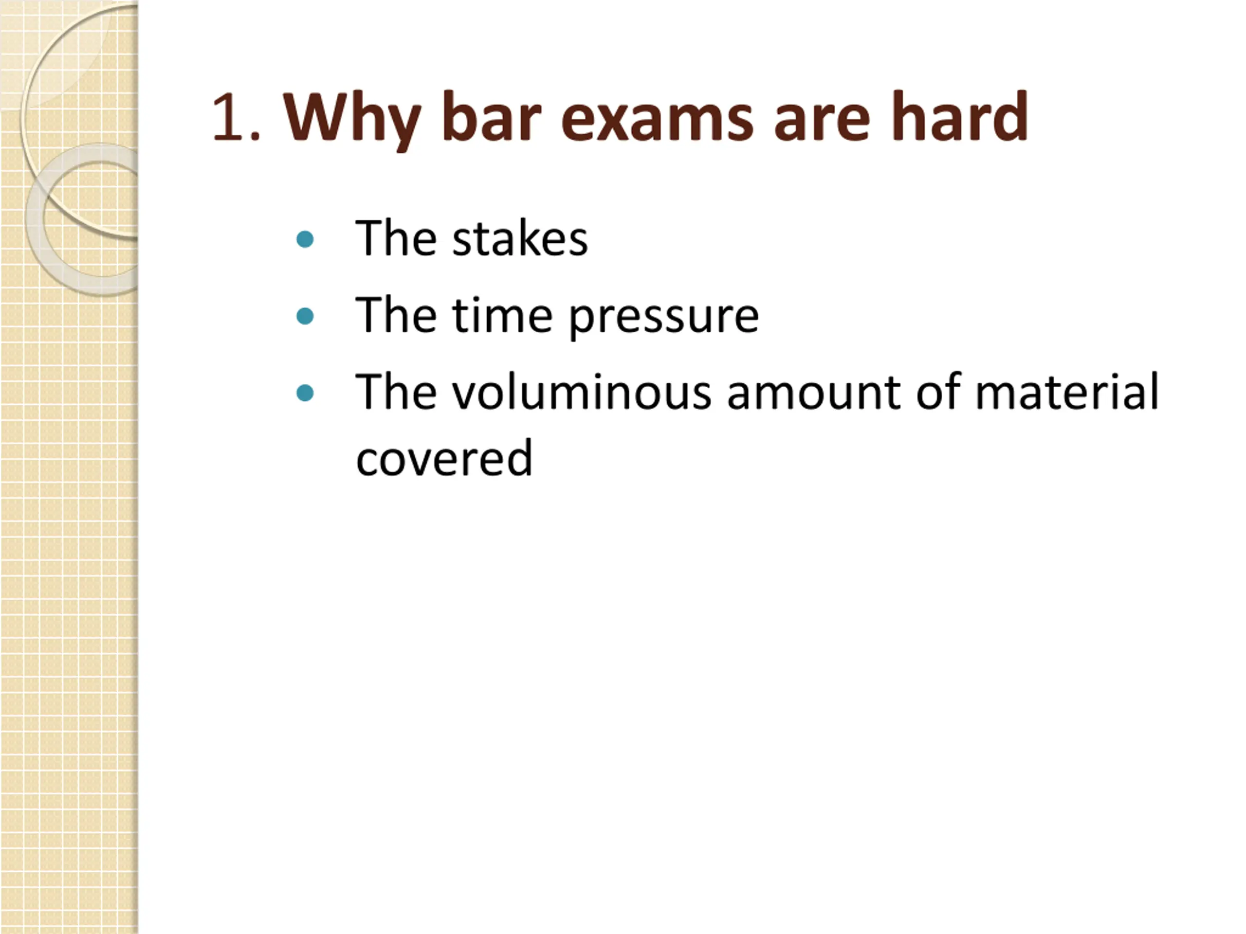 1. Why bar exams are hard The stakes The time pressure The voluminous amount of material covered