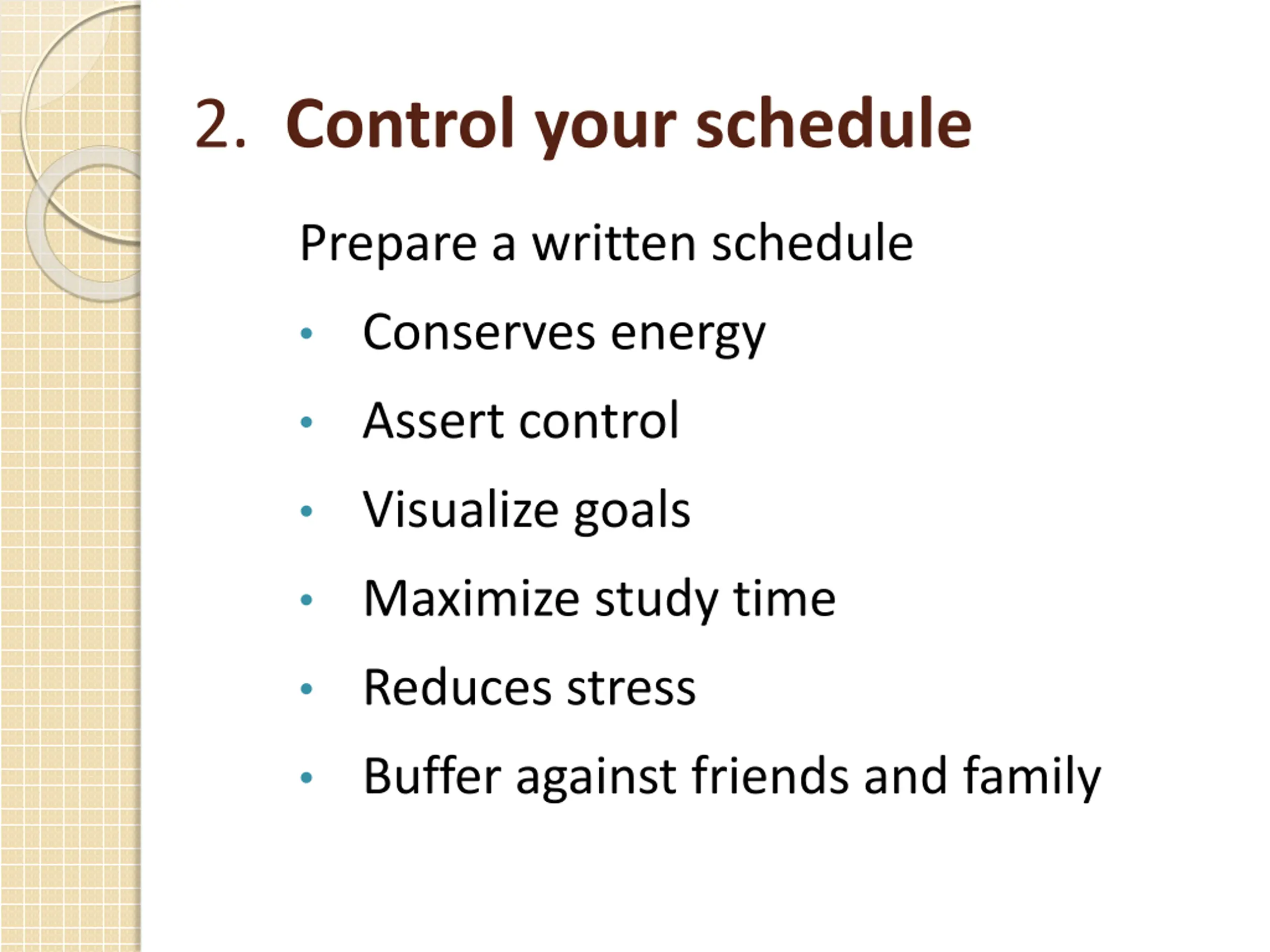 2. Control your schedule Prepare a written schedule Conserves energy Assert control Visualize goals Maximize study time Reduces stress Buffer against friends and family
