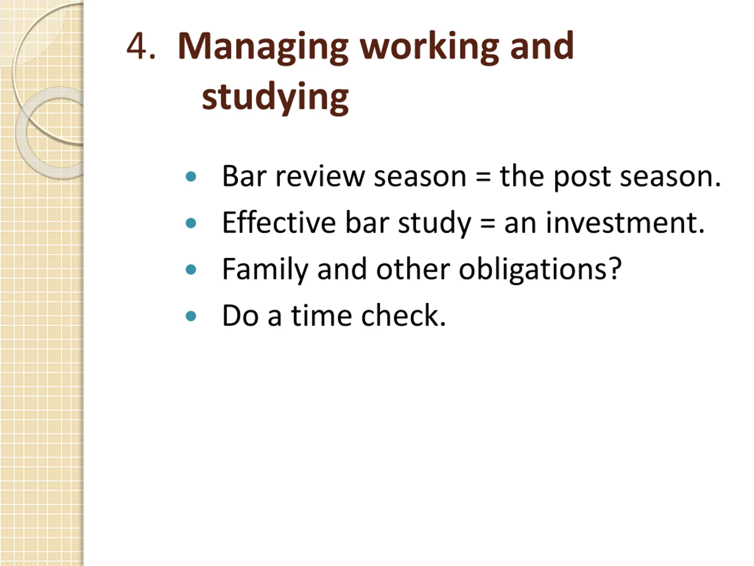 4. Managing working and studying Bar review season = the post season. Effective bar study = an investment. Family and other obligations? Do a time check.