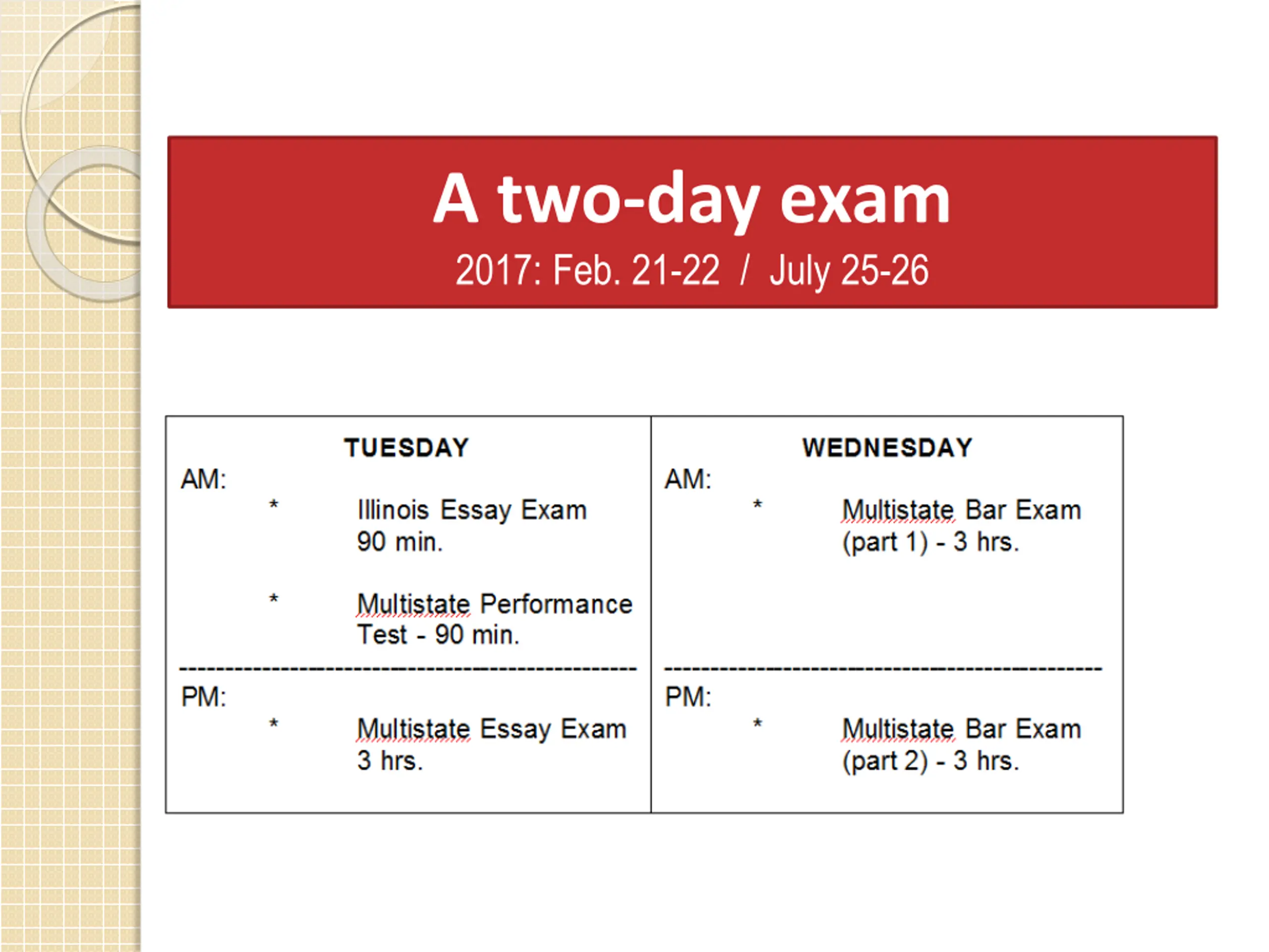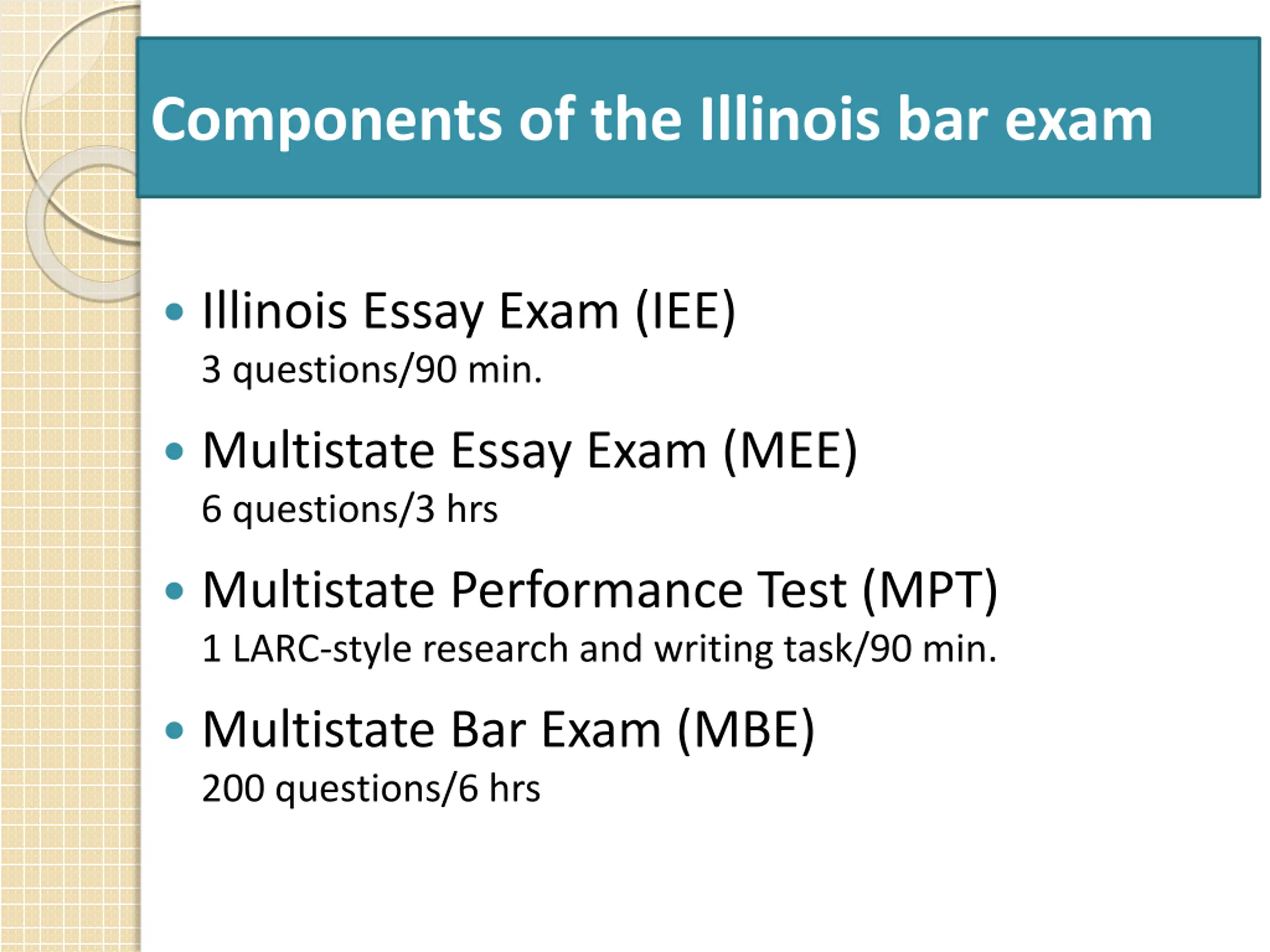 Components of the Illinois bar exam Illinois Essay Exam (IEE) 3 questions/90 min. Multistate Essay Exam (MEE) 6 questions/3 hrs Multistate Performance Test (MPT) 1 LARC-style research and writing task/90 min. Multistate Bar Exam (MBE) 200 questions/6 hrs