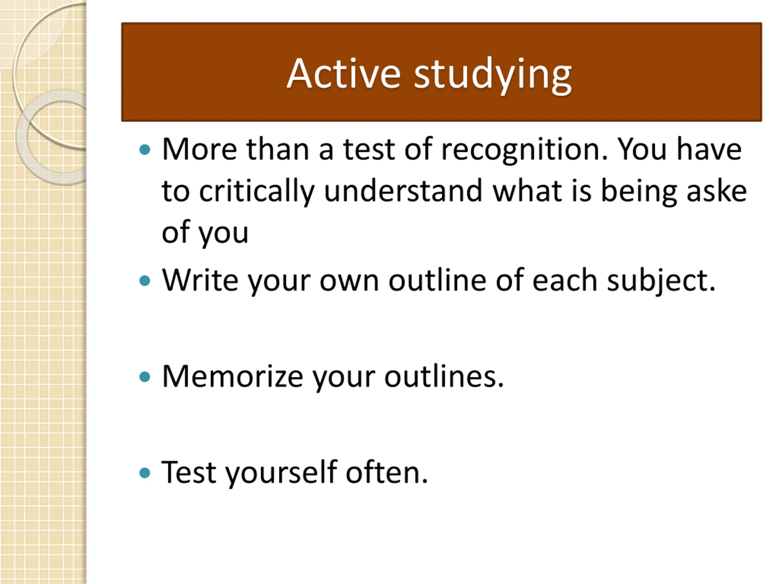 Active studying More than a test of recognition. You have to critically understand what is being aske of you Write your own outline of each subject. Memorize your outlines. Test yourself often.