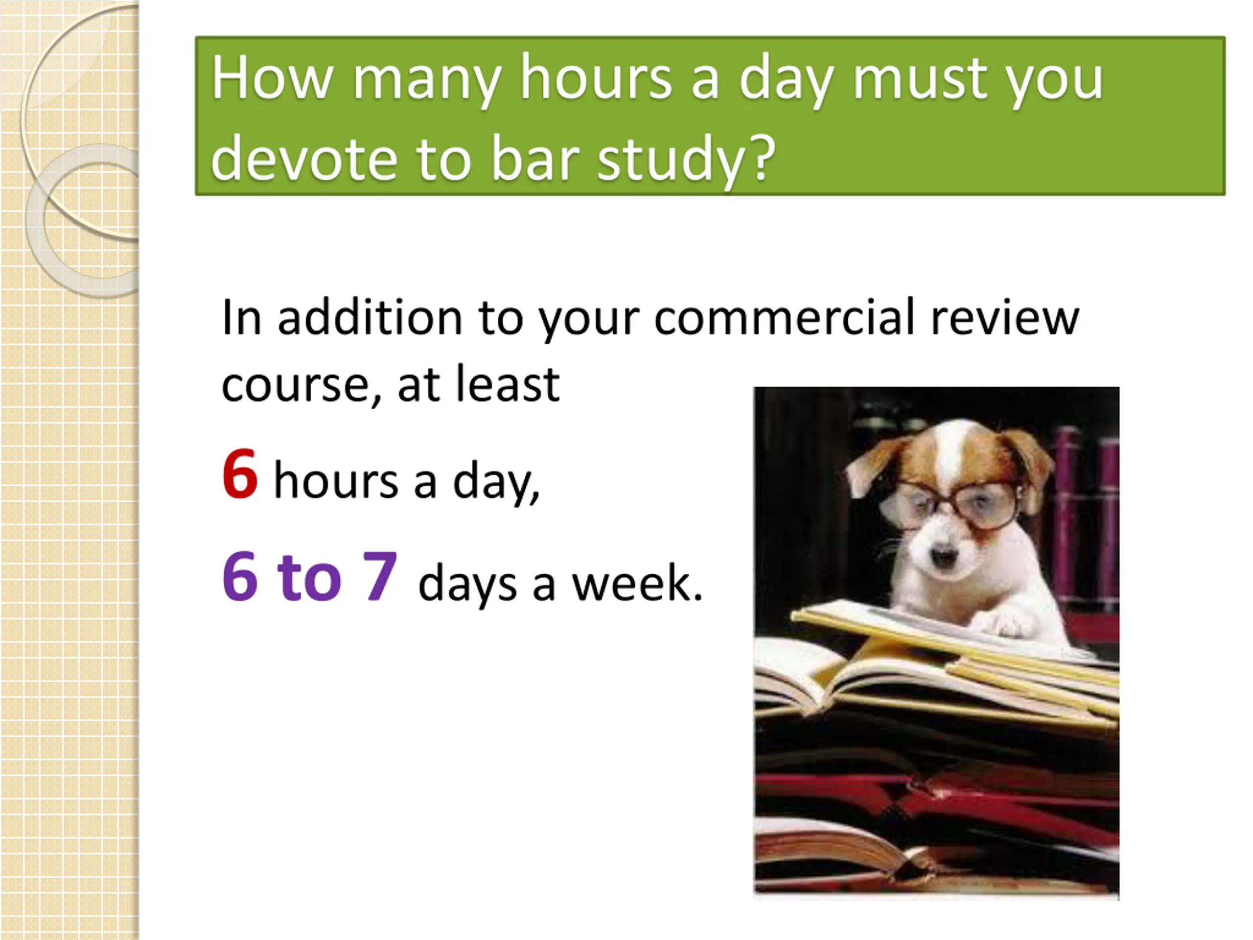 How many hours a day must you devote to bar study? In addition to your commercial review course, at least 6 hours a day, 6 to 7 days a week.
