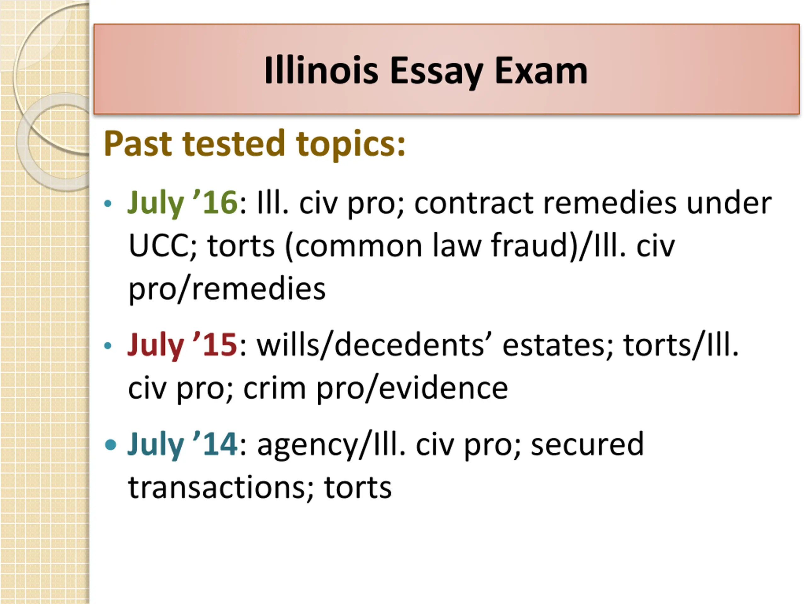Illinois Essay Exam Past tested topics: July 16: Ill. civ pro; contract remedies under UCC; torts (common law fraud)/Ill. civ pro/remedies July 15: wills/decedents estates; torts/Ill. civ pro; crim pro/evidence July 14: agency/Ill. civ pro; secured transactions; torts