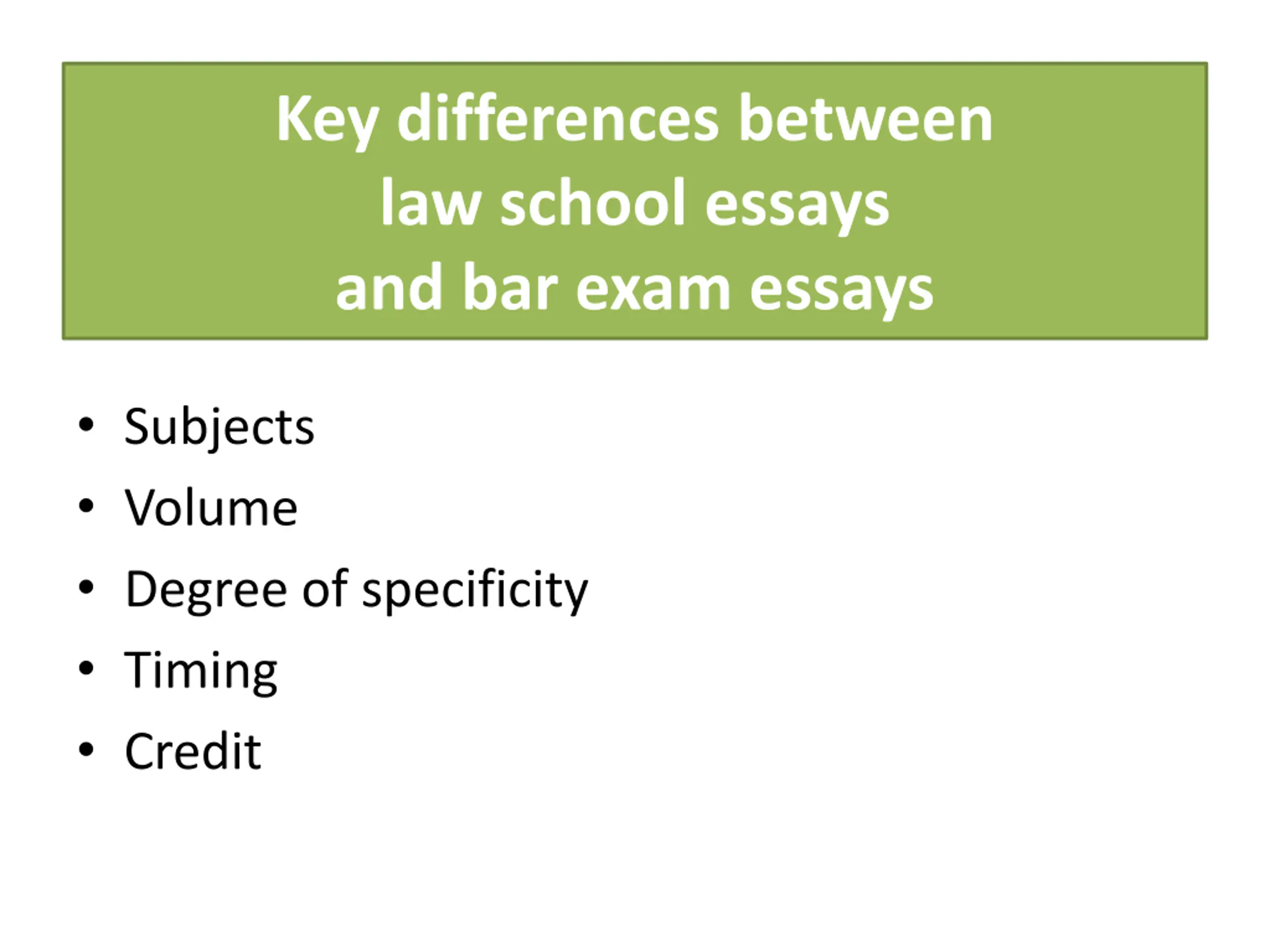 Key differences between law school essays and bar exam essays Subjects Volume Degree of specificity Timing Credit