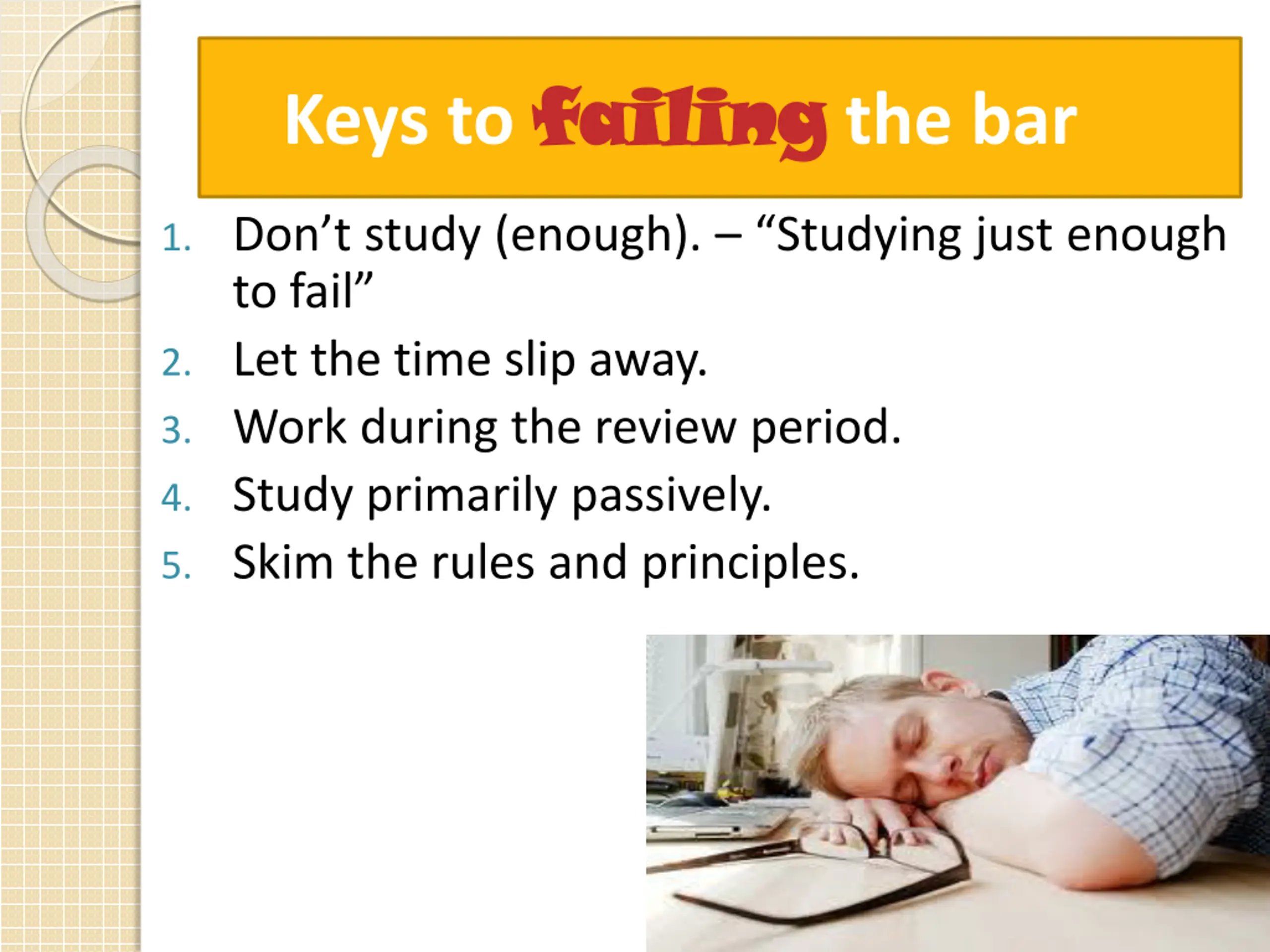 Keys to failing failing the bar 1. Don t study (enough). Studying just enough to fail 2. Let the time slip away. 3. Work during the review period. 4. Study primarily passively. 5. Skim the rules and principles.