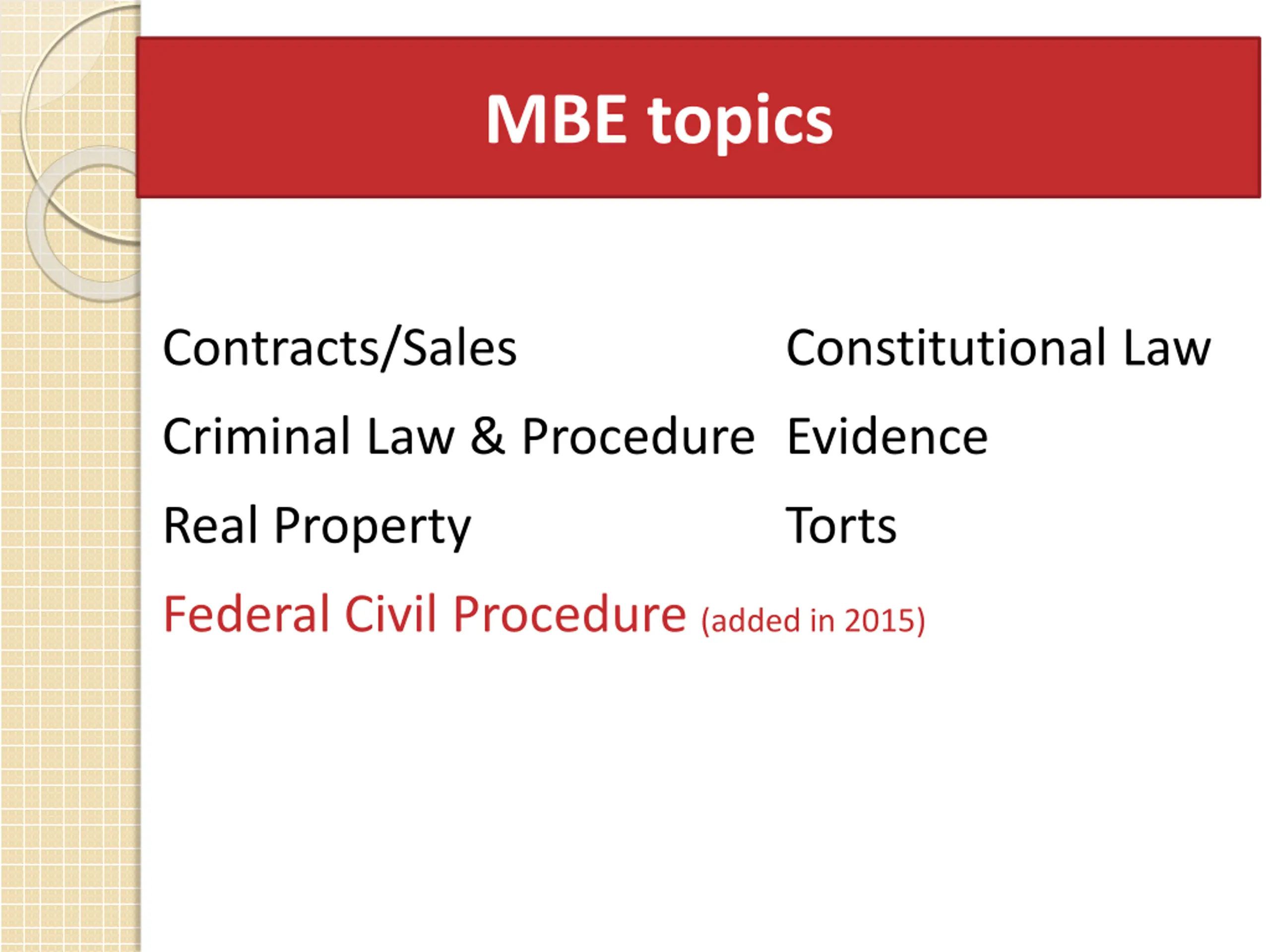 MBE topics Contracts/Sales Constitutional Law Criminal Law & Procedure Evidence Real Property Torts Federal Civil Procedure (added in 2015)