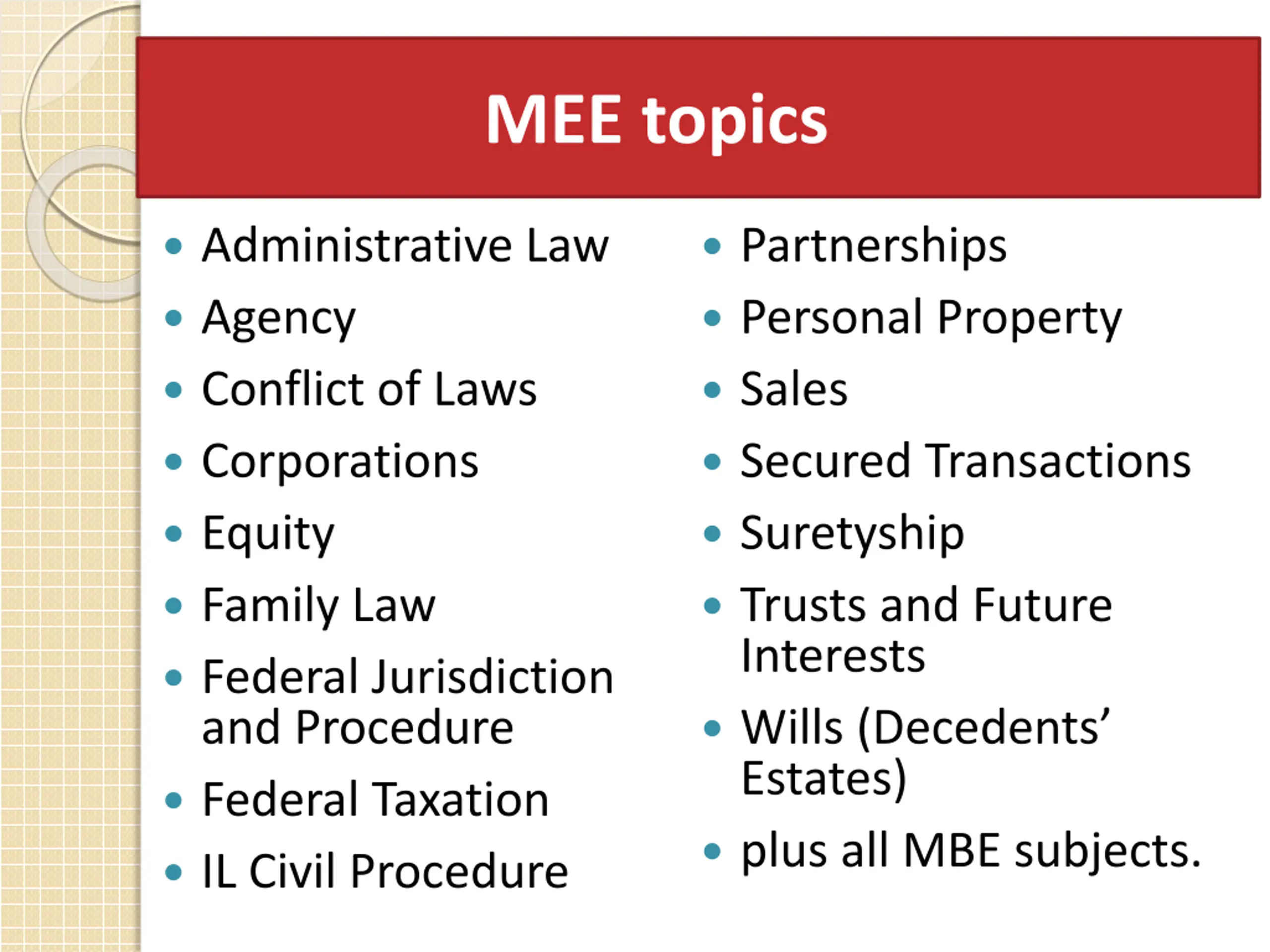 MEE topics Administrative Law Agency Conflict of Laws Corporations Equity Family Law Federal Jurisdiction and Procedure Federal Taxation IL Civil Procedure Partnerships Personal Property Sales Secured Transactions Suretyship Trusts and Future Interests Wills (Decedents Estates) plus all MBE subjects.