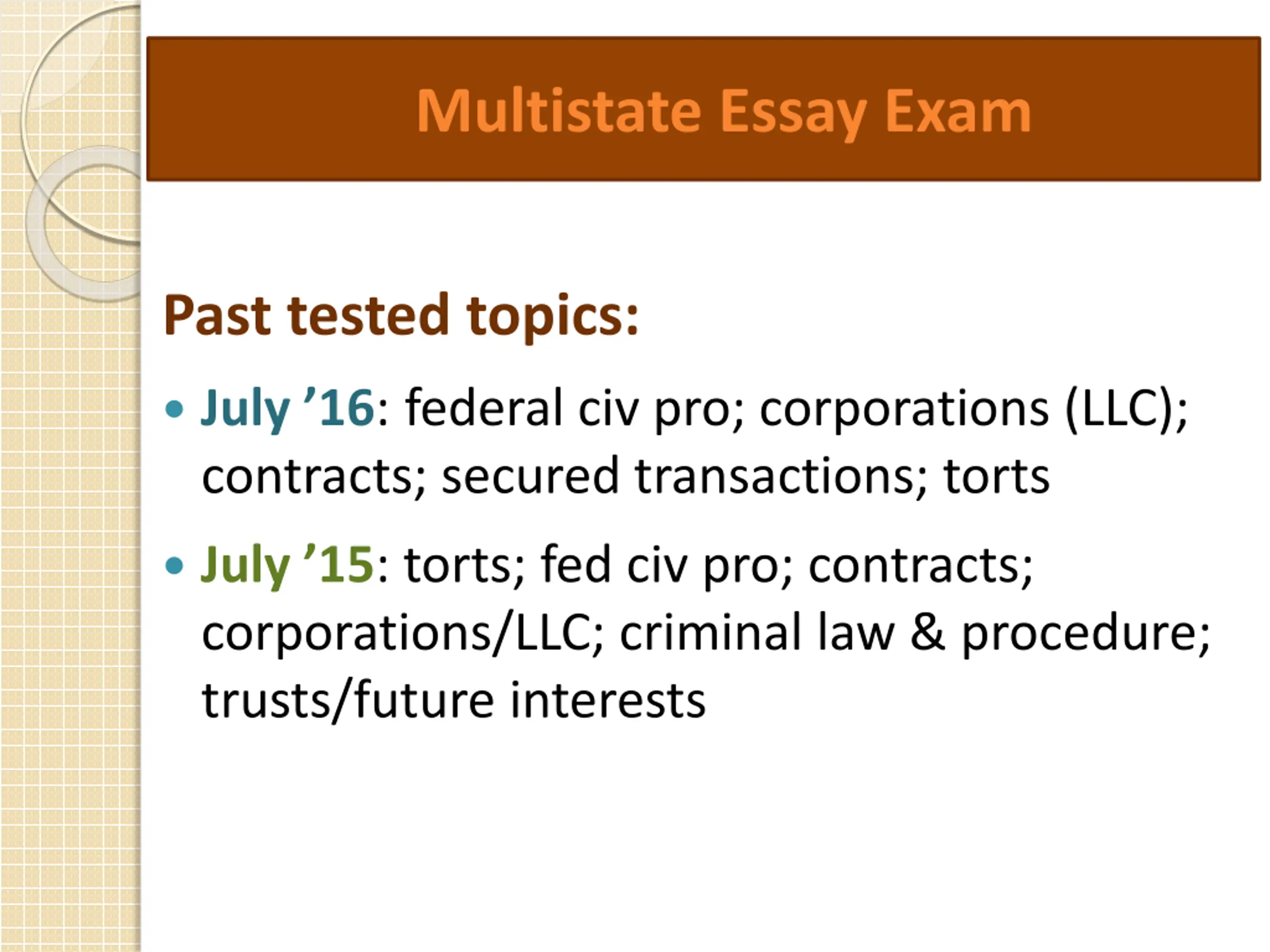 Multistate Essay Exam Past tested topics: July 16: federal civ pro; corporations (LLC); contracts; secured transactions; torts July 15: torts; fed civ pro; contracts; corporations/LLC; criminal law & procedure; trusts/future interests