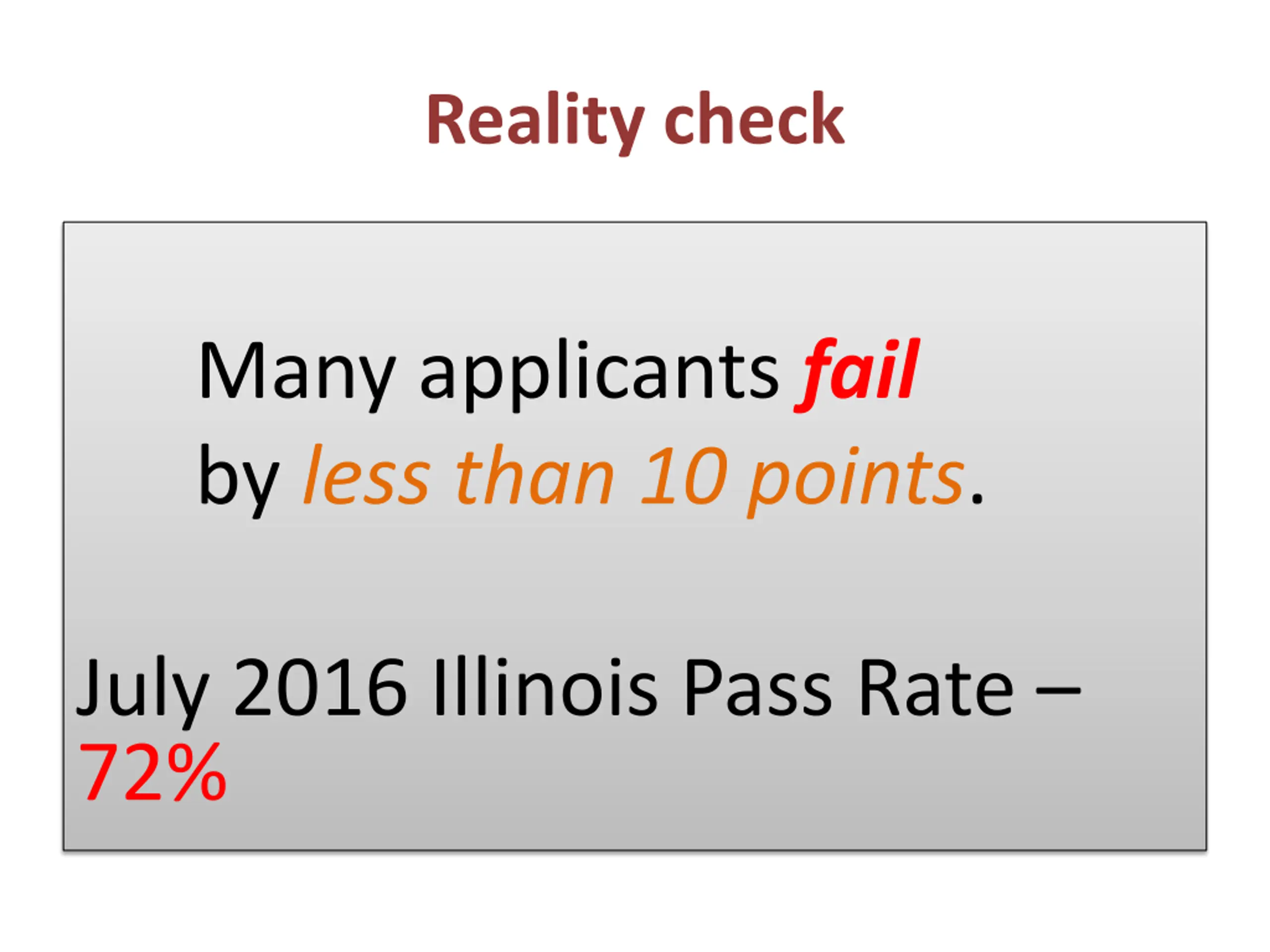 Reality check Many applicants fail by less than 10 points. July 2016 Illinois Pass Rate 72%