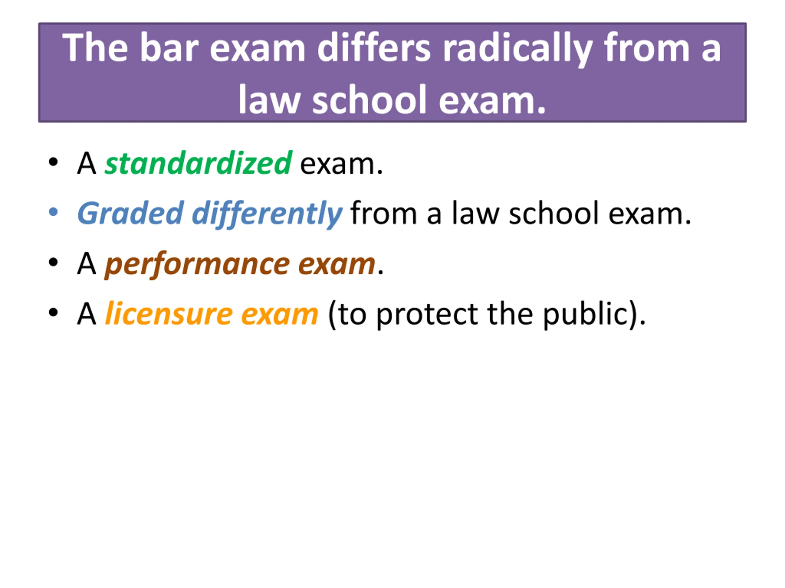 The bar exam differs radically from a law school exam. A standardized exam. Graded differently from a law school exam. A performance exam. A licensure exam (to protect the public).