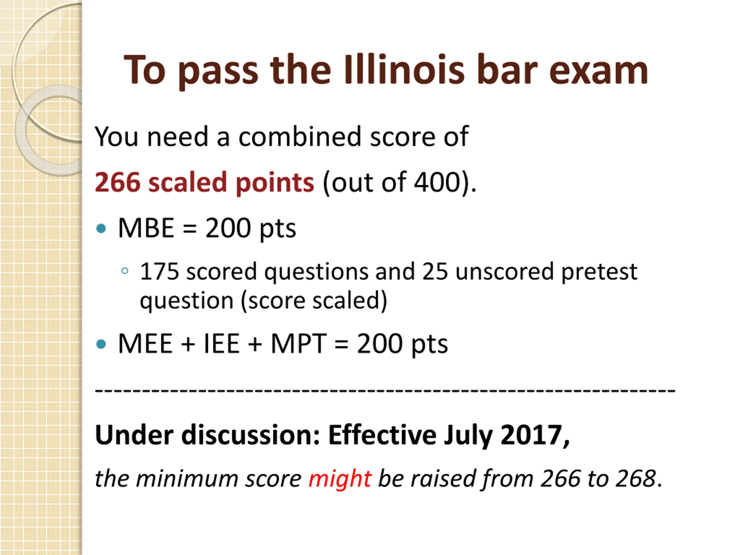 To pass the Illinois bar exam You need a combined score of 266 scaled points (out of 400). MBE = 200 pts 175 scored questions and 25 unscored pretest question (score scaled) MEE + IEE + MPT = 200 pts -------------------------------------------------------------- Under discussion: Effective July 2017, the minimum score might be raised from 266 to 268.