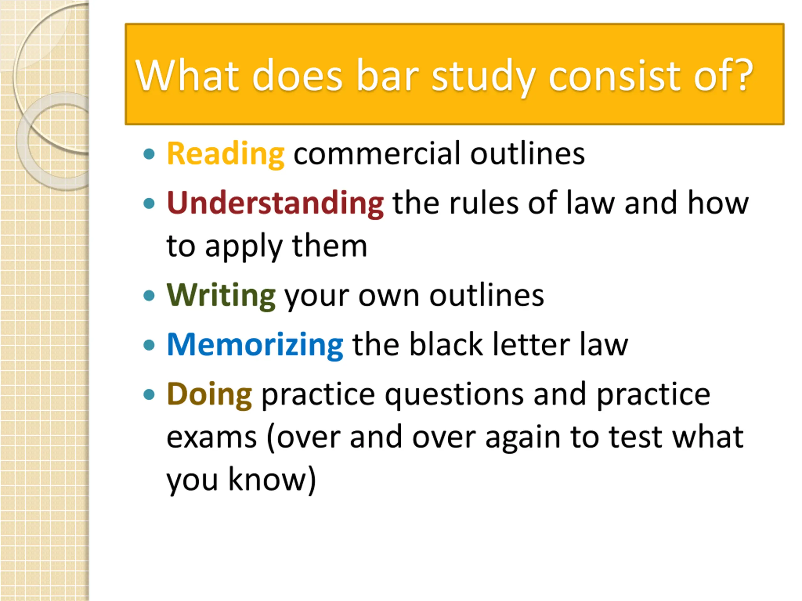 What does bar study consist of? Reading commercial outlines Understanding the rules of law and how to apply them Writing your own outlines Memorizing the black letter law Doing practice questions and practice exams (over and over again to test what you know)