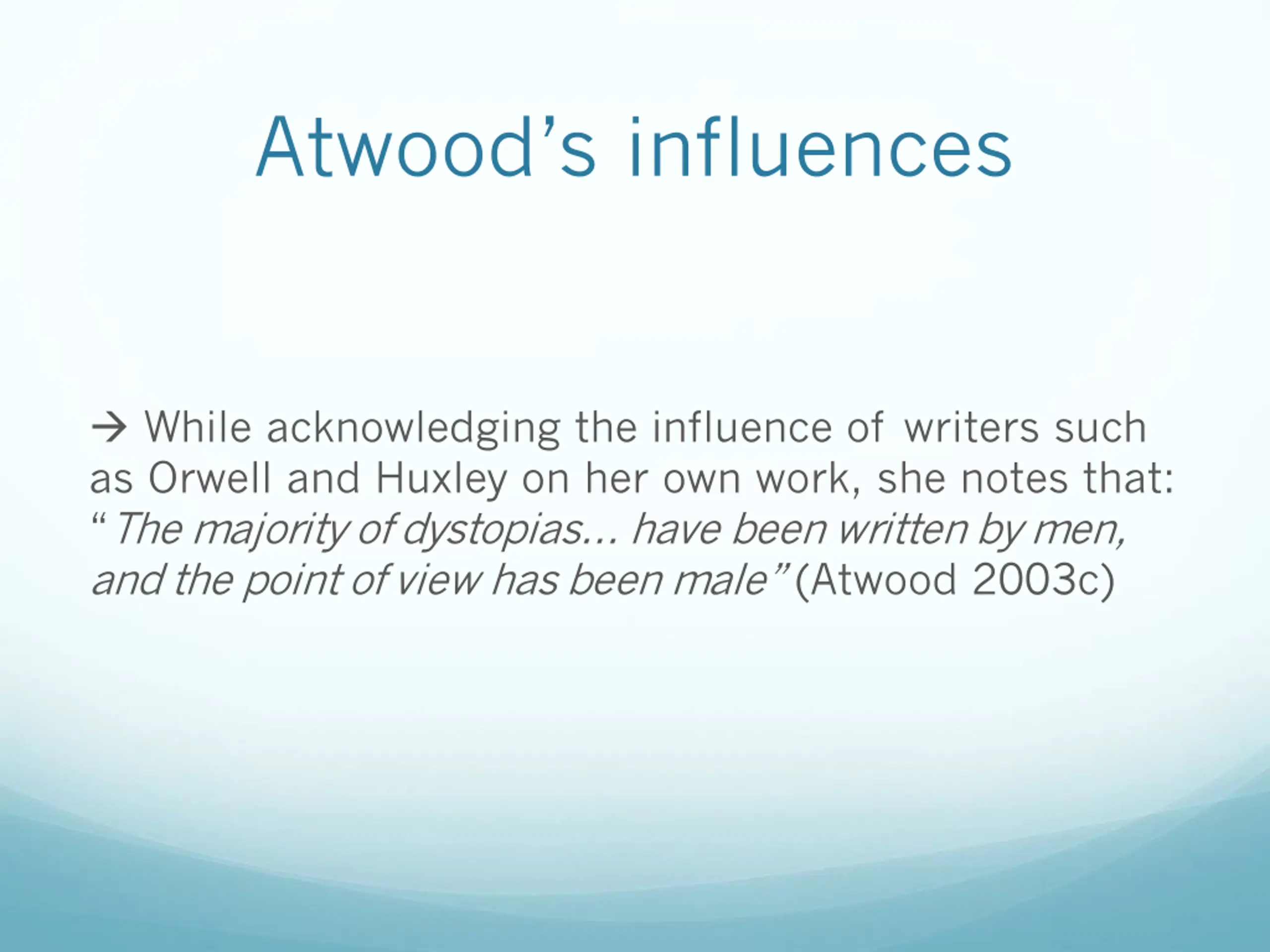 Atwoods influences While acknowledging the influence of writers such as Orwell and Huxley on her own work, she notes that: The majority of dystopias have been written by men, and the point of view has been male (Atwood 2003c)
