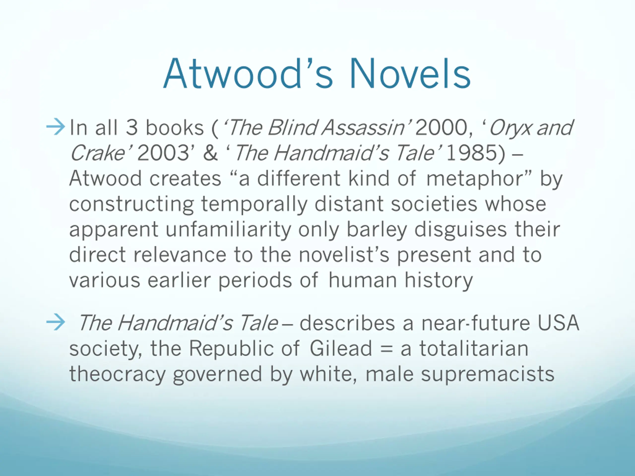 Atwoods Novels In all 3 books ( The Blind Assassin 2000, Oryx and Crake 2003 & The Handmaid s Tale 1985) Atwood creates a different kind of metaphor by constructing temporally distant societies whose apparent unfamiliarity only barley disguises their direct relevance to the novelist s present and to various earlier periods of human history The Handmaid s Tale describes a near-future USA society, the Republic of Gilead = a totalitarian theocracy governed by white, male supremacists