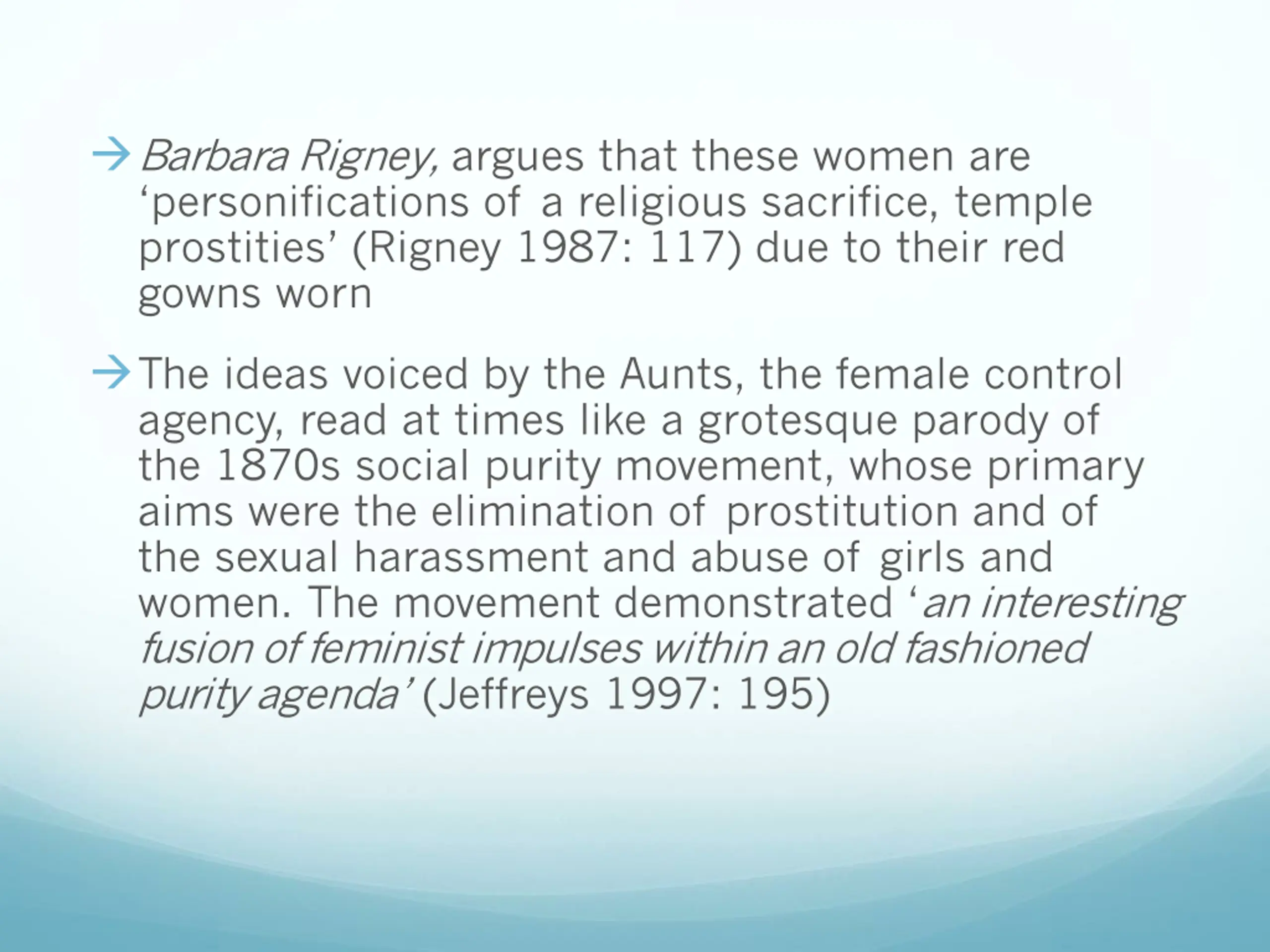 Barbara Rigney, argues that these women are personifications of a religious sacrifice, temple prostities (Rigney 1987: 117) due to their red gowns worn The ideas voiced by the Aunts, the female control agency, read at times like a grotesque parody of the 1870s social purity movement, whose primary aims were the elimination of prostitution and of the sexual harassment and abuse of girls and women. The movement demonstrated an interesting fusion of feminist impulses within an old fashioned purity agenda (Jeffreys 1997: 195)