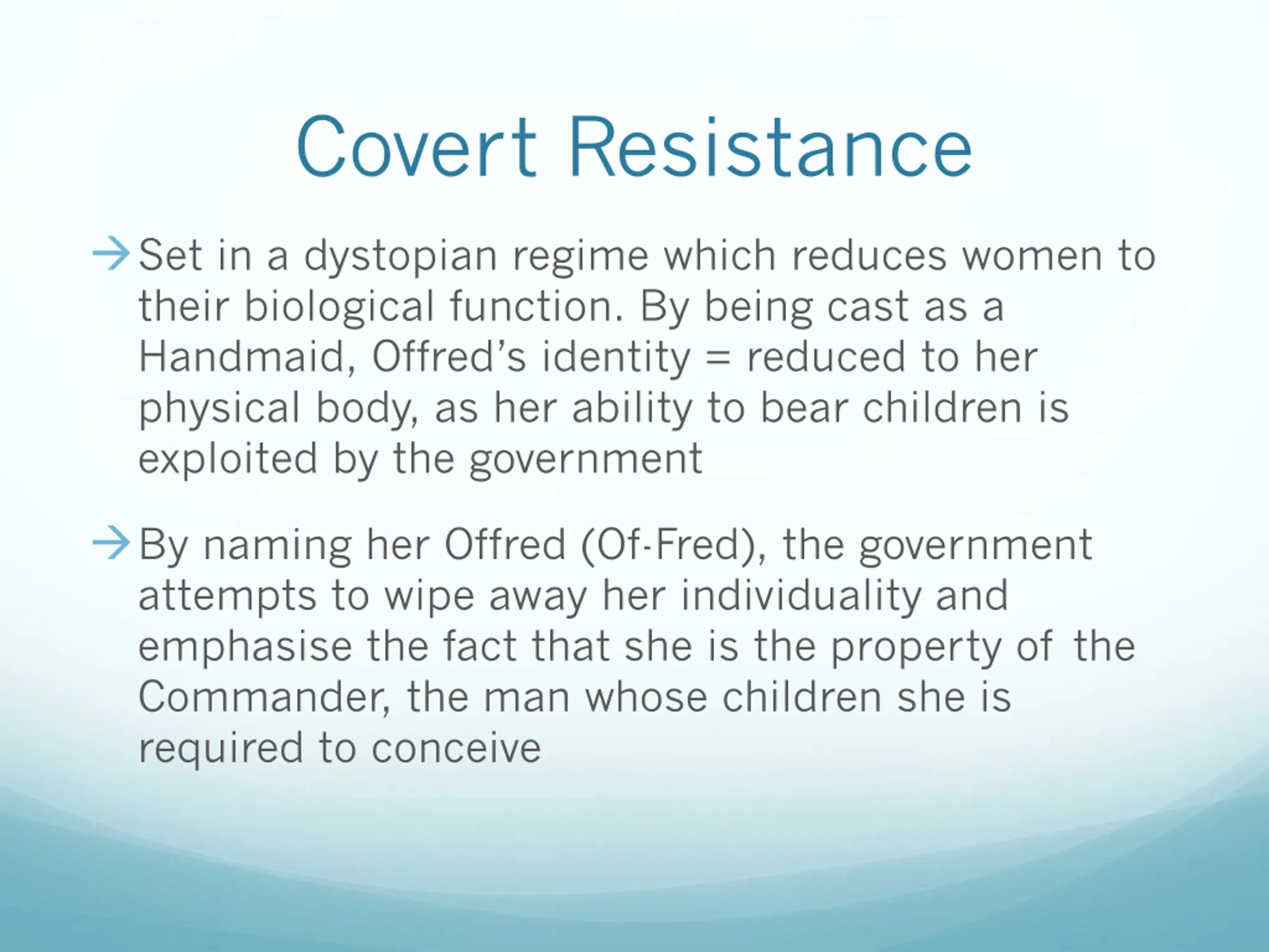 Covert Resistance Set in a dystopian regime which reduces women to their biological function. By being cast as a Handmaid, Offred s identity = reduced to her physical body, as her ability to bear children is exploited by the government By naming her Offred (Of-Fred), the government attempts to wipe away her individuality and emphasise the fact that she is the property of the Commander, the man whose children she is required to conceive