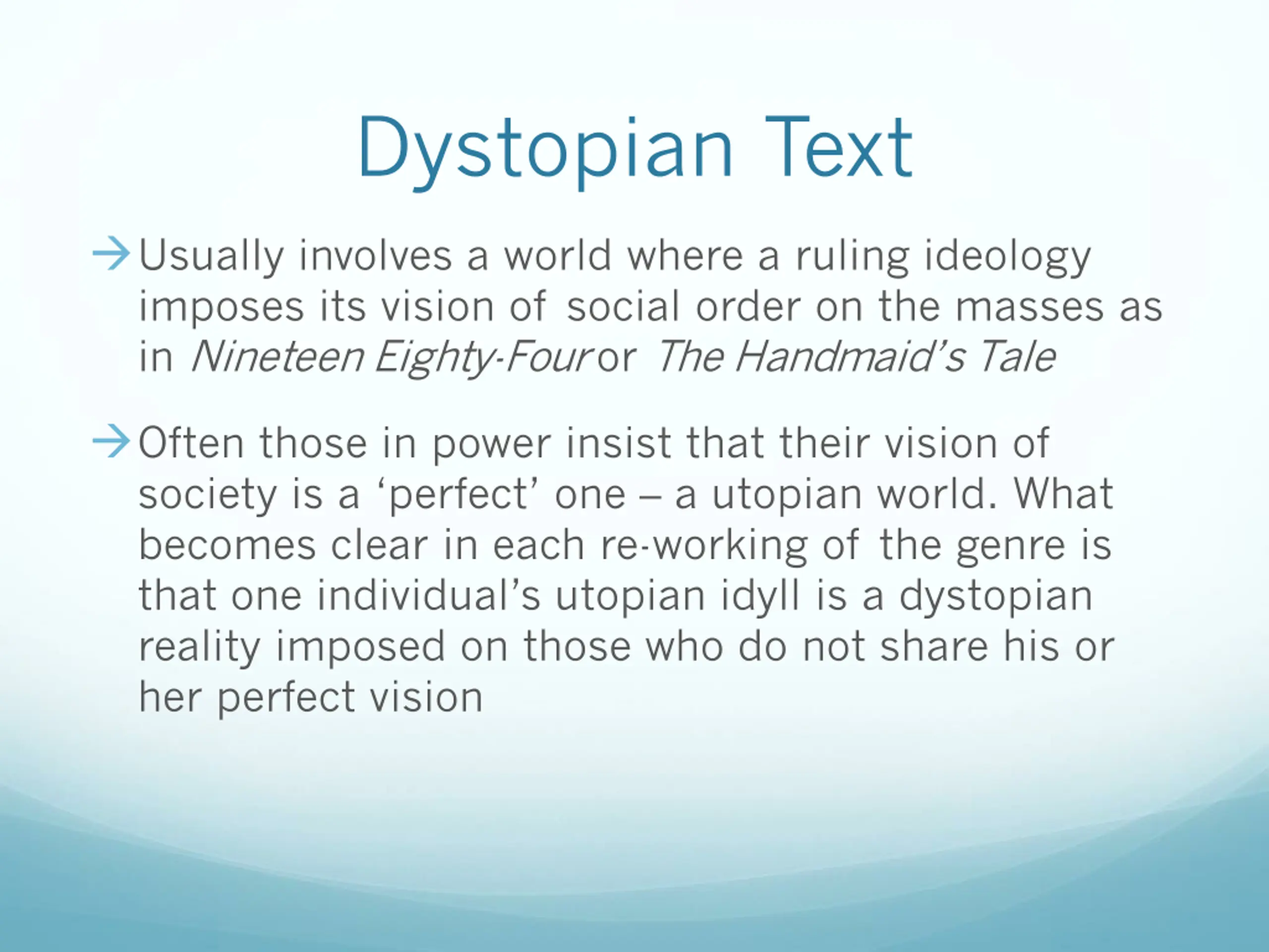 Dystopian Text Usually involves a world where a ruling ideology imposes its vision of social order on the masses as in Nineteen Eighty-Four or The Handmaid s Tale Often those in power insist that their vision of society is a perfect one a utopian world. What becomes clear in each re-working of the genre is that one individual s utopian idyll is a dystopian reality imposed on those who do not share his or her perfect vision