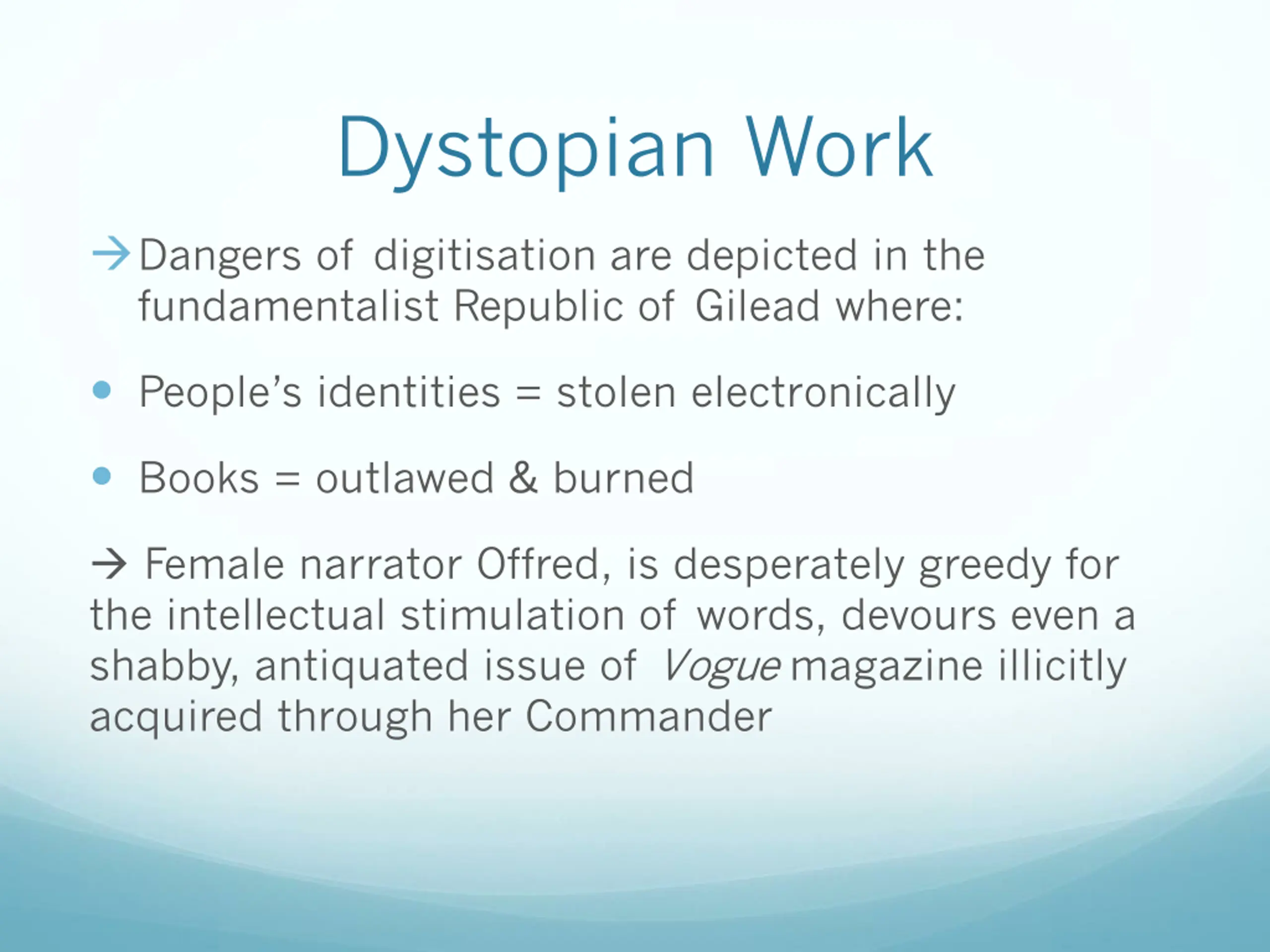 Dystopian Work Dangers of digitisation are depicted in the fundamentalist Republic of Gilead where: People s identities = stolen electronically Books = outlawed & burned Female narrator Offred, is desperately greedy for the intellectual stimulation of words, devours even a shabby, antiquated issue of Vogue magazine illicitly acquired through her Commander