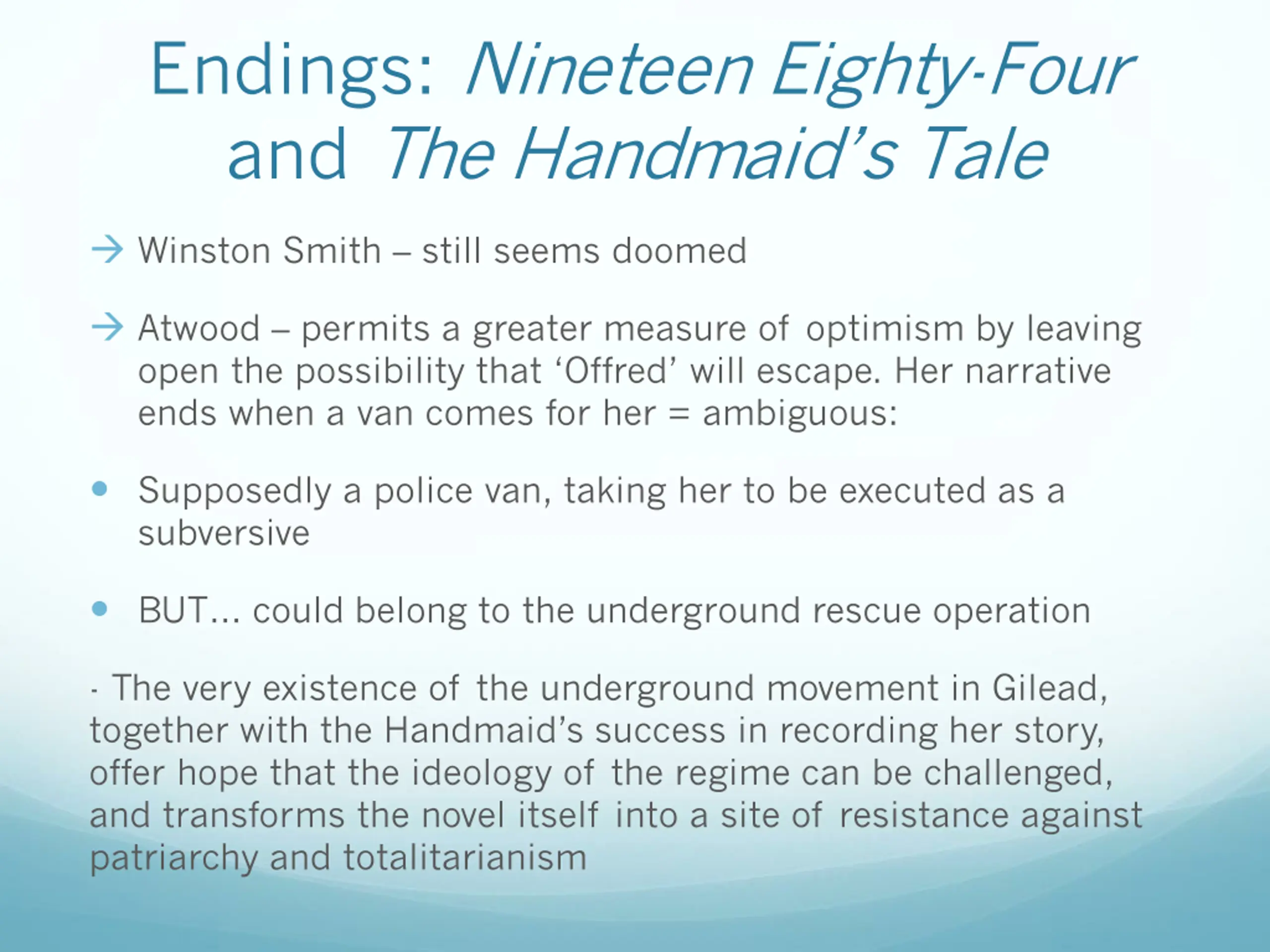 Endings: Nineteen Eighty-Four and The Handmaid s Tale Winston Smith still seems doomed Atwood permits a greater measure of optimism by leaving open the possibility that Offred will escape. Her narrative ends when a van comes for her = ambiguous: Supposedly a police van, taking her to be executed as a subversive BUT could belong to the underground rescue operation - The very existence of the underground movement in Gilead, together with the Handmaid s success in recording her story, offer hope that the ideology of the regime can be challenged, and transforms the novel itself into a site of resistance against patriarchy and totalitarianism