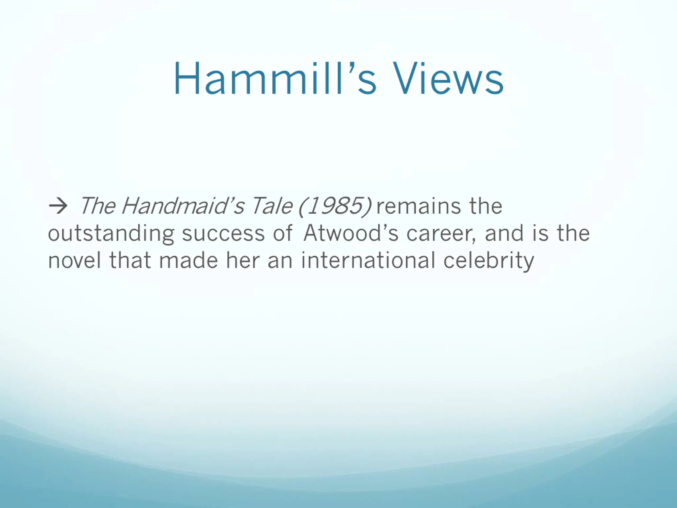 Hammills Views The Handmaid s Tale (1985) remains the outstanding success of Atwood s career, and is the novel that made her an international celebrity