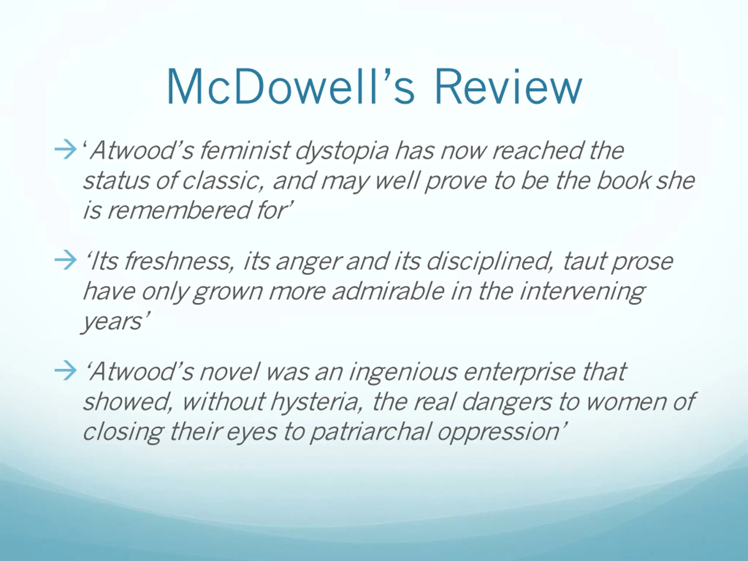 McDowells Review Atwood s feminist dystopia has now reached the status of classic, and may well prove to be the book she is remembered for Its freshness, its anger and its disciplined, taut prose have only grown more admirable in the intervening years Atwood s novel was an ingenious enterprise that showed, without hysteria, the real dangers to women of closing their eyes to patriarchal oppression