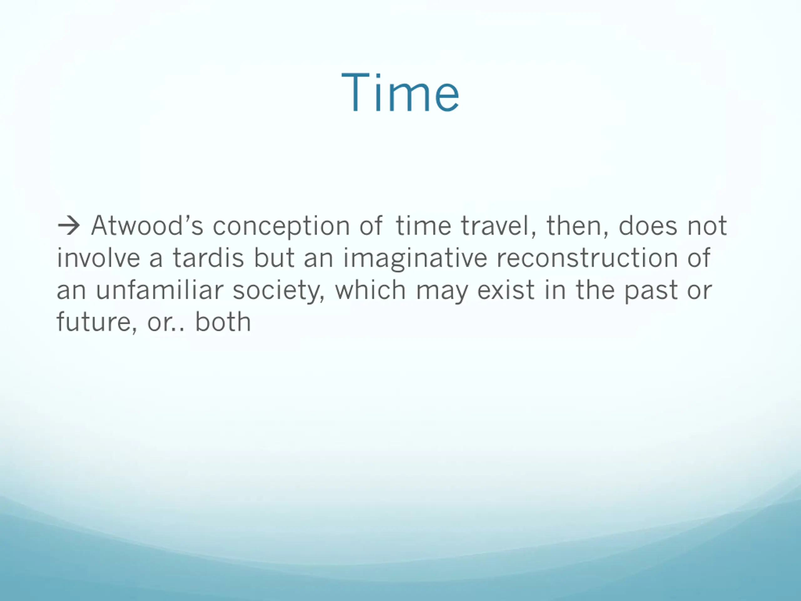 Time Atwood s conception of time travel, then, does not involve a tardis but an imaginative reconstruction of an unfamiliar society, which may exist in the past or future, or.. both