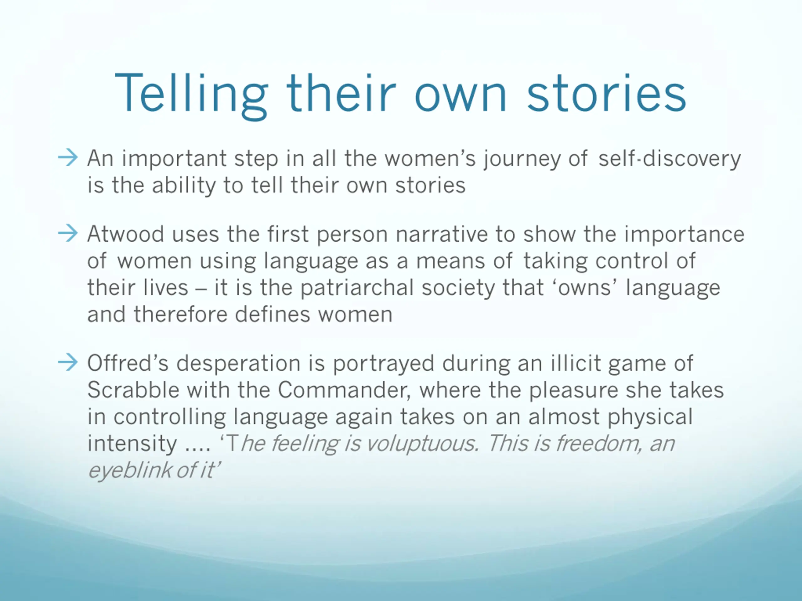 Telling their own stories An important step in all the women s journey of self-discovery is the ability to tell their own stories Atwood uses the first person narrative to show the importance of women using language as a means of taking control of their lives it is the patriarchal society that owns language and therefore defines women Offred s desperation is portrayed during an illicit game of Scrabble with the Commander, where the pleasure she takes in controlling language again takes on an almost physical intensity . The feeling is voluptuous. This is freedom, an eyeblinkof it