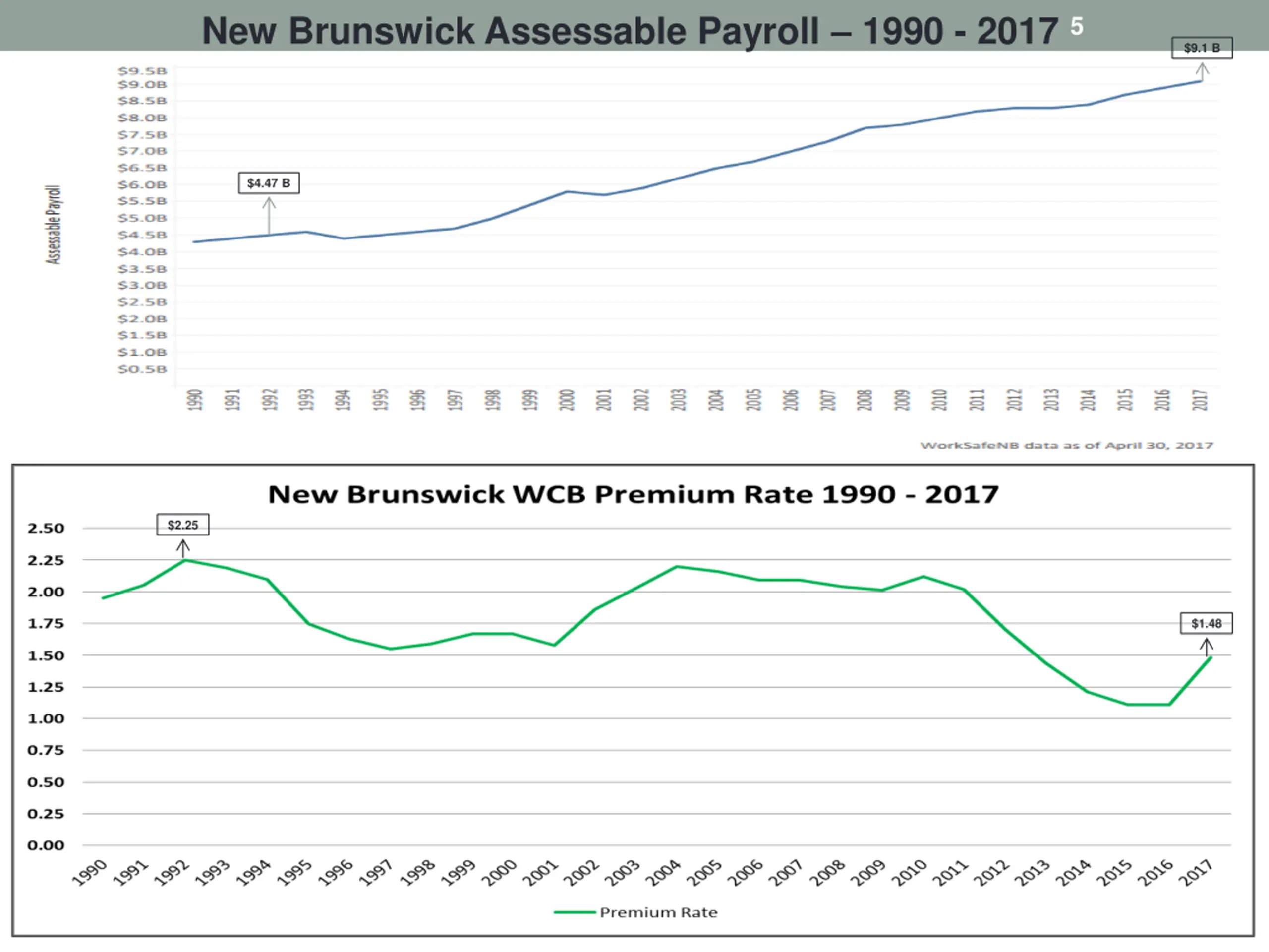 New Brunswick Assessable Payroll 1990 - 2017 5 $9.1 B $4.47 B $2.25 $1.48