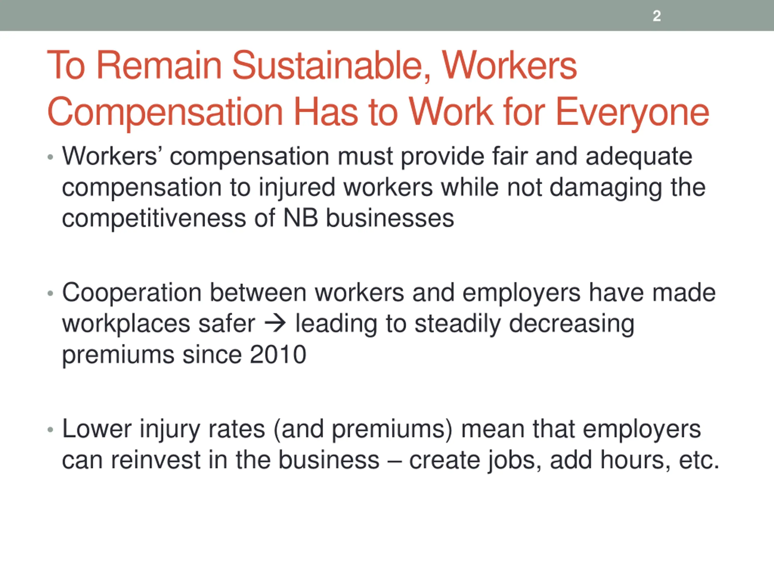 2 To Remain Sustainable, Workers Compensation Has to Work for Everyone Workers compensation must provide fair and adequate compensation to injured workers while not damaging the competitiveness of NB businesses Cooperation between workers and employers have made workplaces safer leading to steadily decreasing premiums since 2010 Lower injury rates (and premiums) mean that employers can reinvest in the business create jobs, add hours, etc.