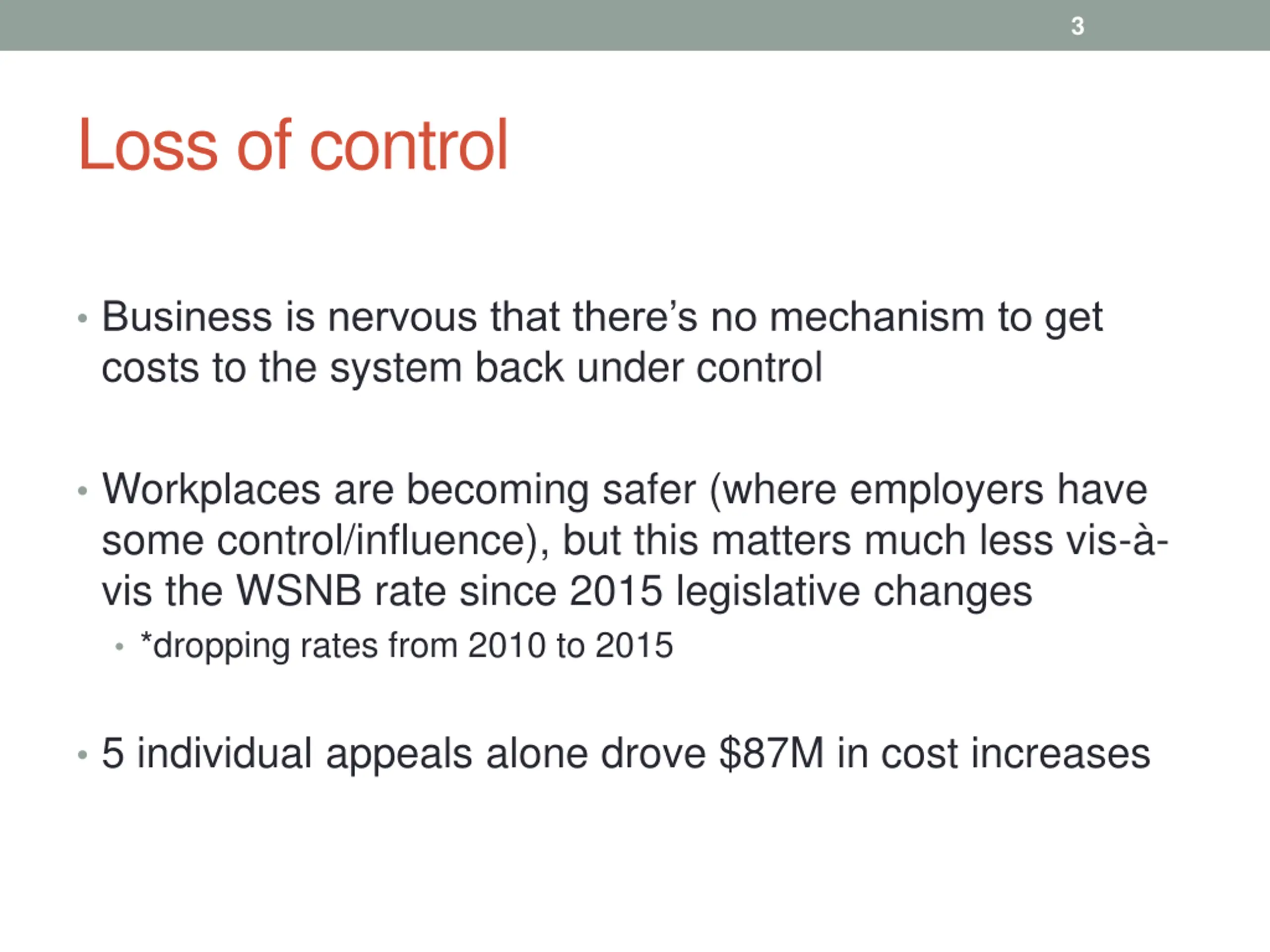 3 Loss of control Business is nervous that there s no mechanism to get costs to the system back under control Workplaces are becoming safer (where employers have some control/influence), but this matters much less vis- - vis the WSNB rate since 2015 legislative changes *dropping rates from 2010 to 2015 5 individual appeals alone drove $87M in cost increases