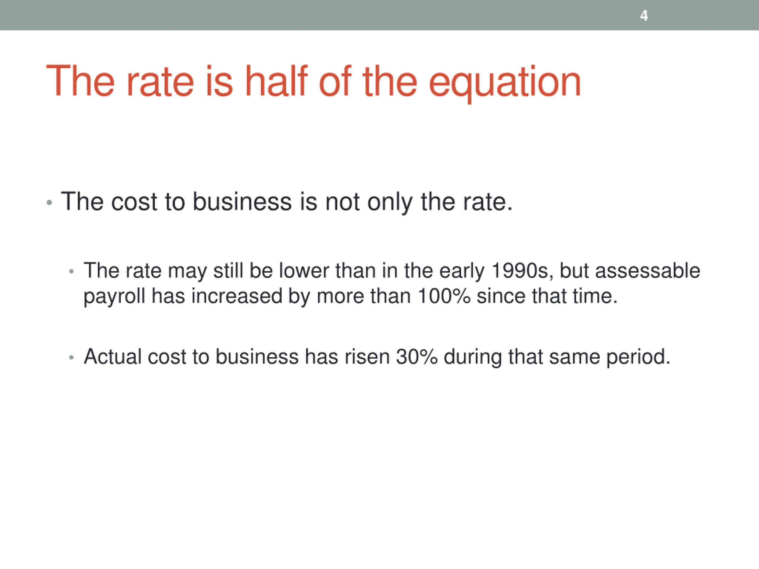 4 The rate is half of the equation The cost to business is not only the rate. The rate may still be lower than in the early 1990s, but assessable payroll has increased by more than 100% since that time. Actual cost to business has risen 30% during that same period.