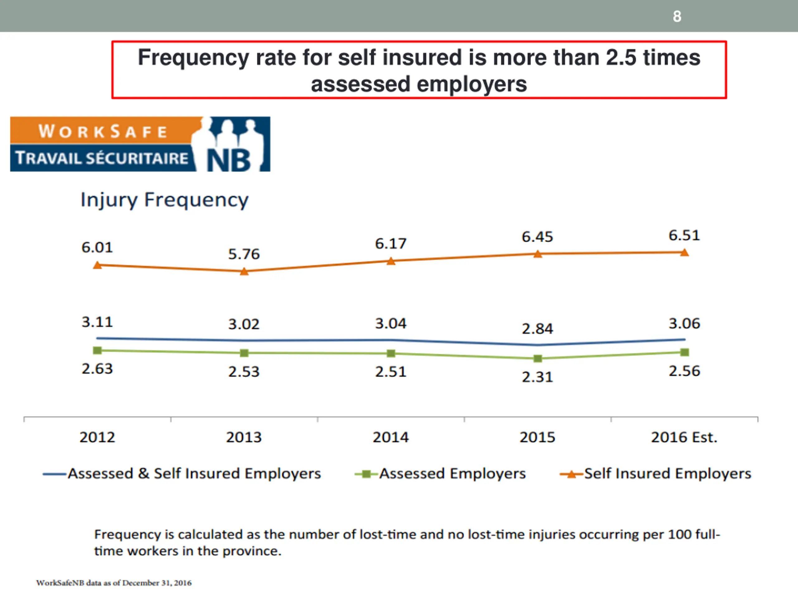 7 Self-Insured Employers An alarming trend with self-insured employers primarily the Government of New Brunswick Frequency rate more than 2.5 times that of assessed employers Concerned about cost to the Province coffers, increased debt