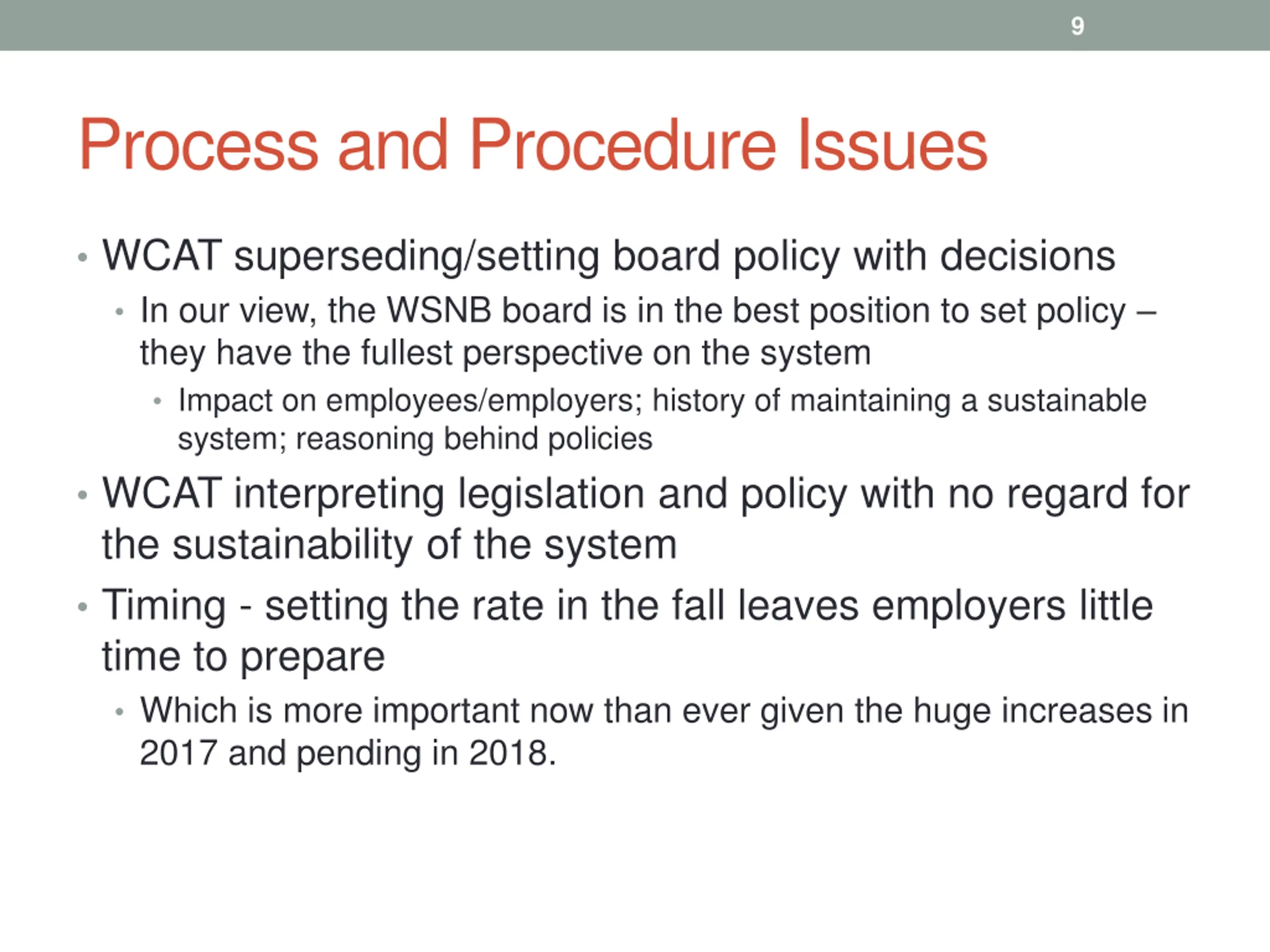 9 Process and Procedure Issues WCAT superseding/setting board policy with decisions In our view, the WSNB board is in the best position to set policy they have the fullest perspective on the system Impact on employees/employers; history of maintaining a sustainable system; reasoning behind policies WCAT interpreting legislation and policy with no regard for the sustainability of the system Timing - setting the rate in the fall leaves employers little time to prepare Which is more important now than ever given the huge increases in 2017 and pending in 2018.