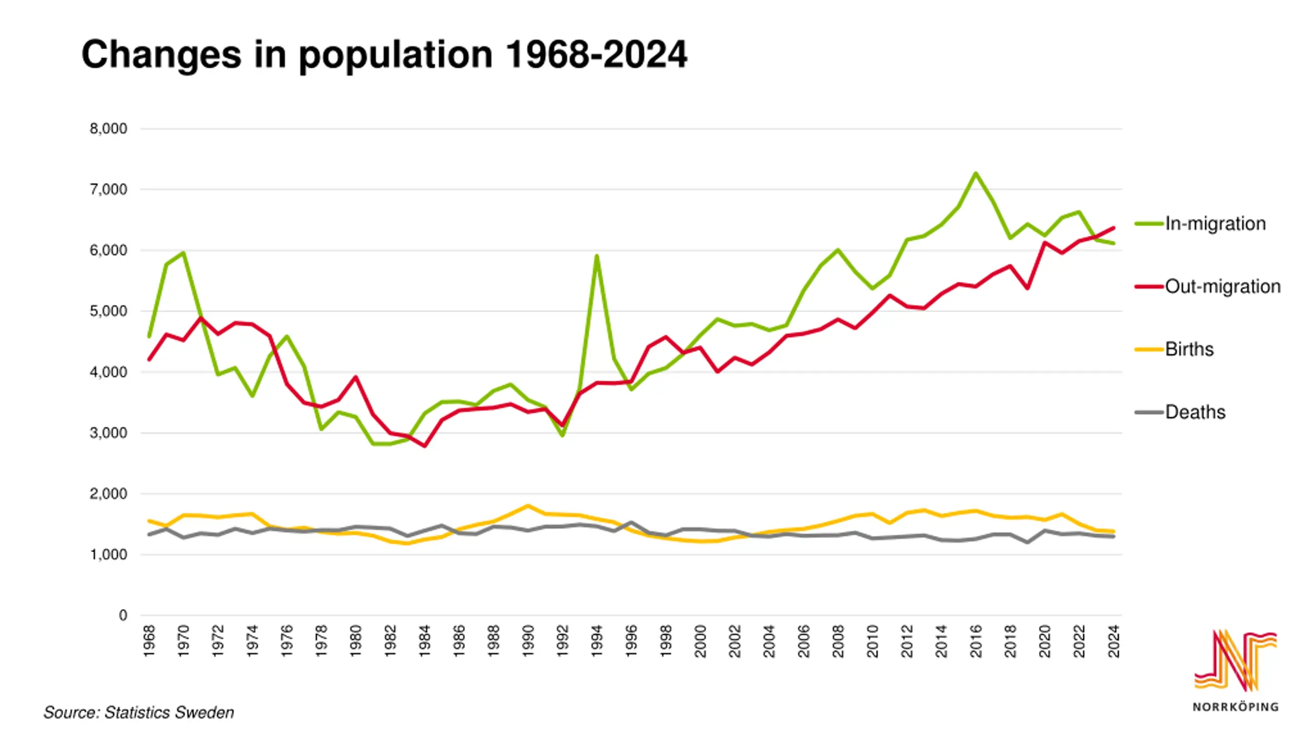 Changes in population 1968-2024 8,000 7,000 In-migration 6,000 Out-migration 5,000 Births 4,000 Deaths 3,000 2,000 1,000 0 1968 1970 1972 1974 1976 1978 1980 1982 1984 1986 1988 1990 1992 1994 1996 1998 2000 2002 2004 2006 2008 2010 2012 2014 2016 2018 2020 2022 2024 Source: Statistics Sweden