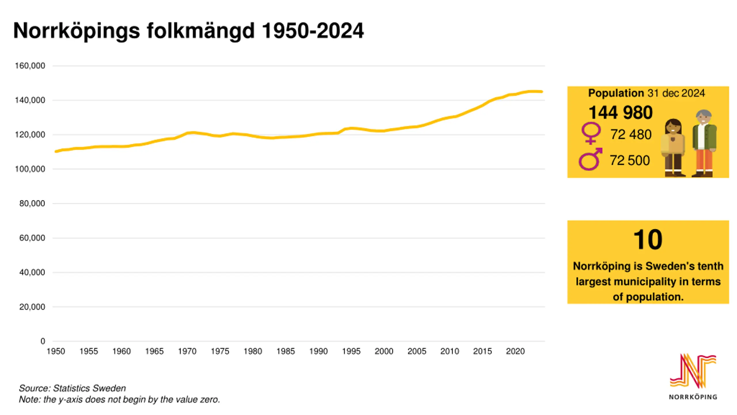 Norrkpings folkmngd 1950-2024 160,000 Population 31 dec 2024 144 980 72 480 140,000 120,000 72 500 100,000 80,000 10 60,000 Norrk ping is Sweden's tenth largest municipality in terms of population. 40,000 20,000 0 1950 1955 1960 1965 1970 1975 1980 1985 1990 1995 2000 2005 2010 2015 2020 Source: Statistics Sweden Note: the y-axis does not begin by the value zero.