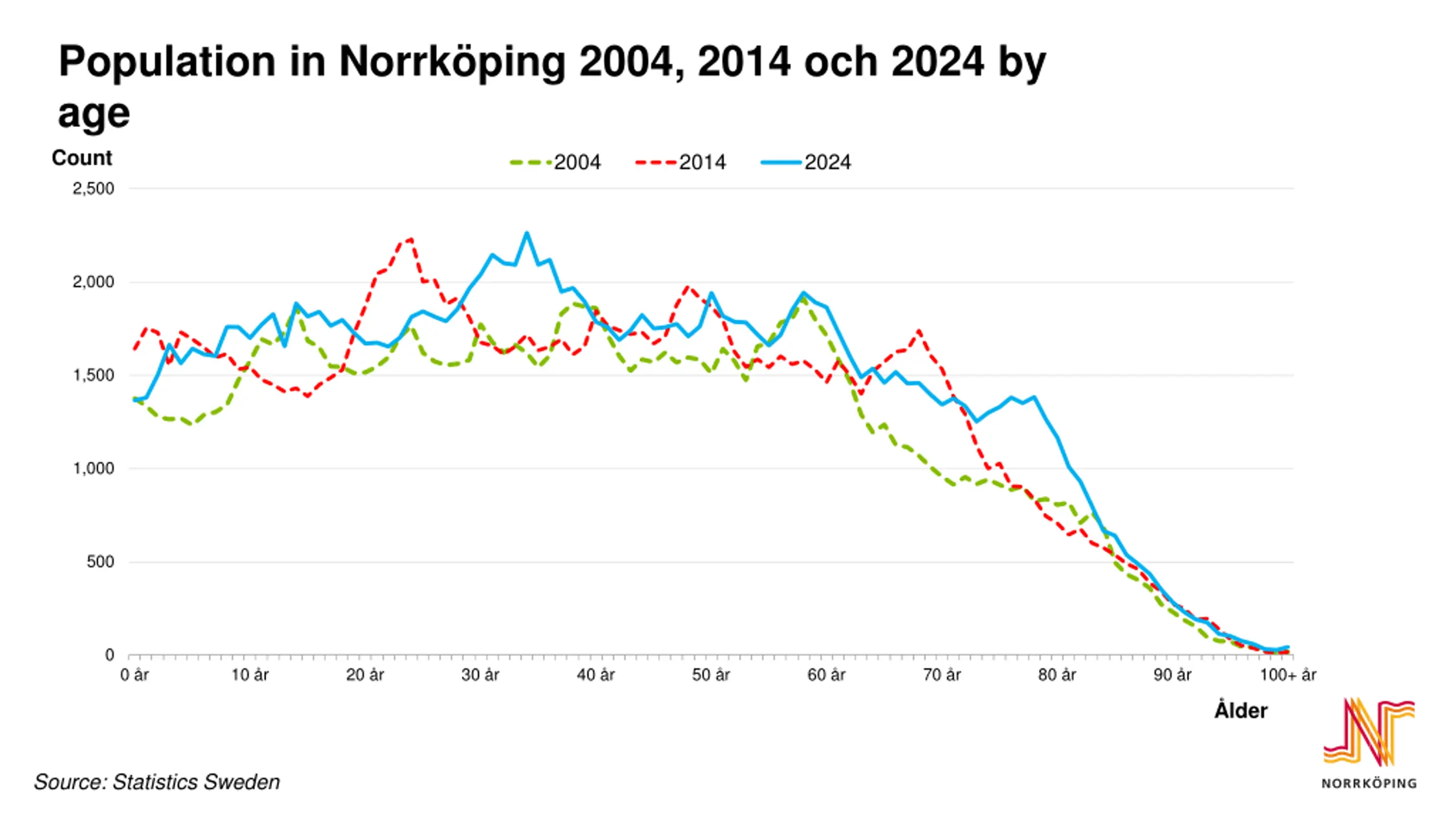 Population in Norrkping 2004, 2014 och 2024 by age Count 2004 2014 2024 2,500 2,000 1,500 1,000 500 0 0 r 10 r 20 r 30 r 40 r 50 r 60 r 70 r 80 r 90 r 100+ r lder Source: Statistics Sweden