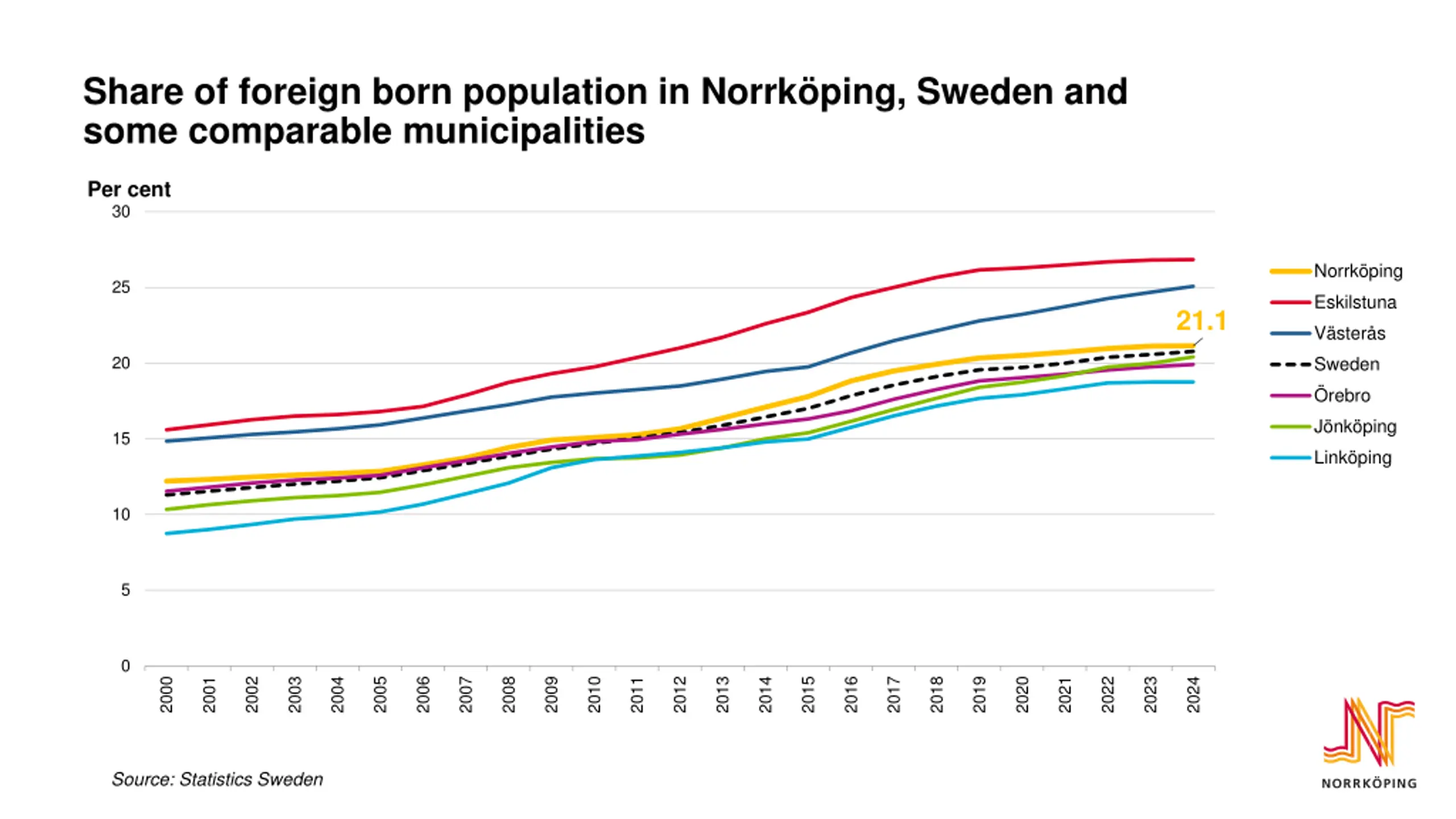 Share of foreign born population in Norrkping, Sweden and some comparable municipalities Per cent 30 Norrk ping 25 Eskilstuna 21.1 V ster s 20 Sweden rebro J nk ping 15 Link ping 10 5 0 2000 2001 2002 2003 2004 2005 2006 2007 2008 2009 2010 2011 2012 2013 2014 2015 2016 2017 2018 2019 2020 2021 2022 2023 2024 Source: Statistics Sweden