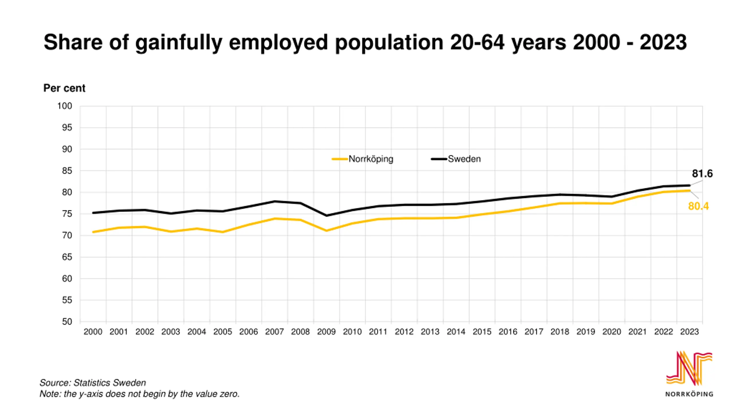 Share of gainfully employed population 20-64 years 2000 - 2023 Per cent 100 95 90 Norrk ping Sweden 85 81.6 80 80.4 75 70 65 60 55 50 2000 2001 2002 2003 2004 2005 2006 2007 2008 2009 2010 2011 2012 2013 2014 2015 2016 2017 2018 2019 2020 2021 2022 2023 Source: Statistics Sweden Note: the y-axis does not begin by the value zero.