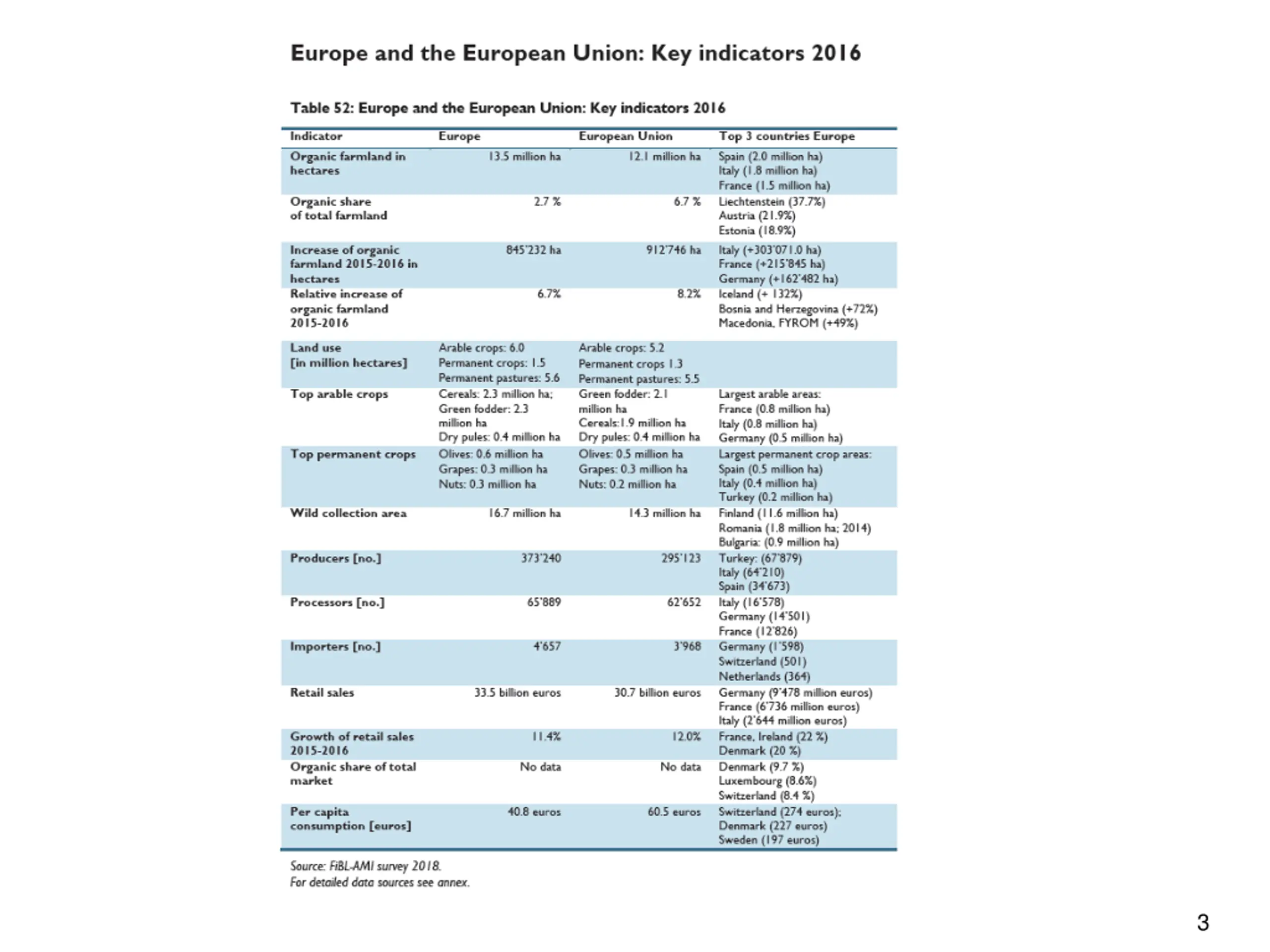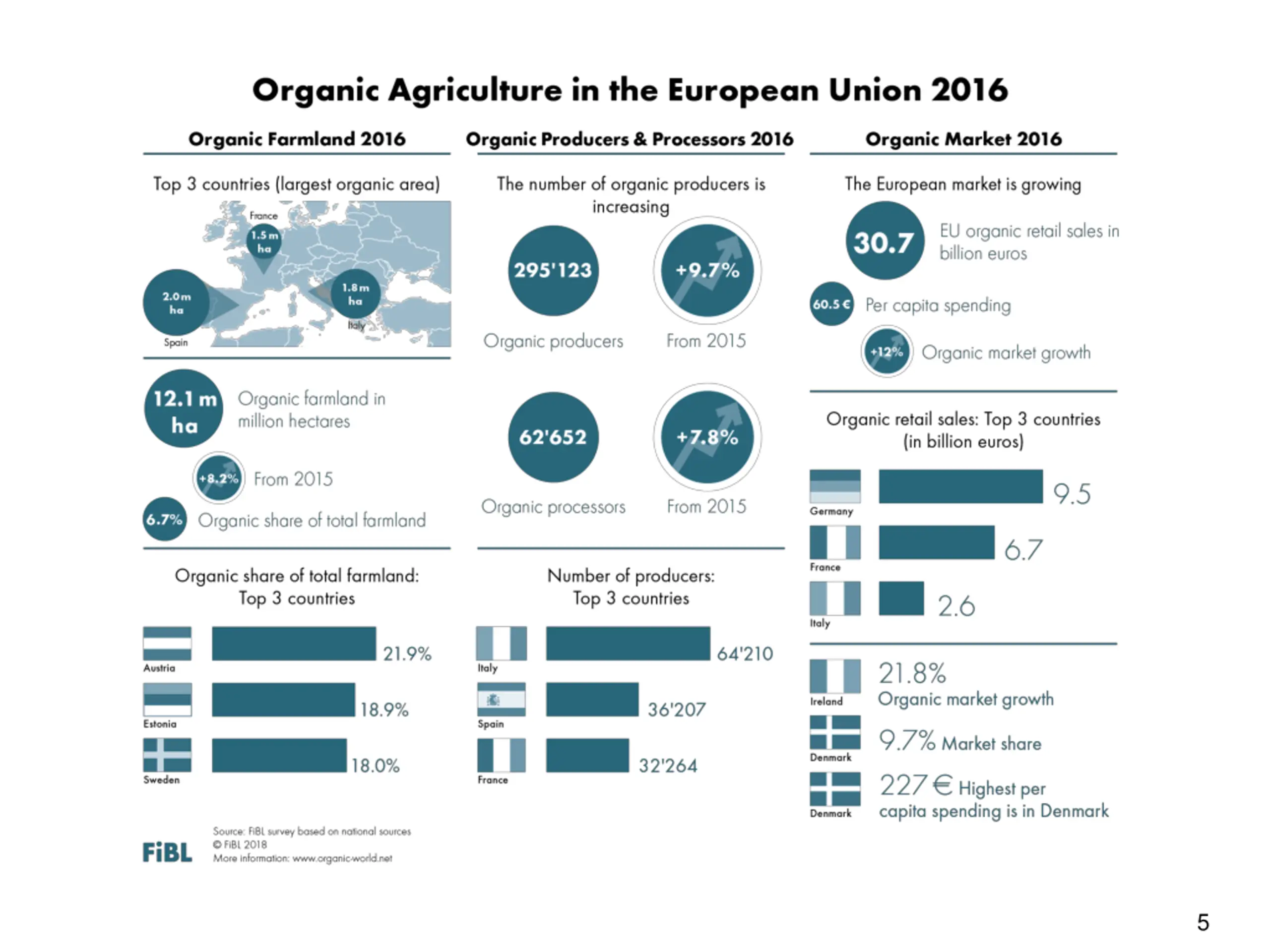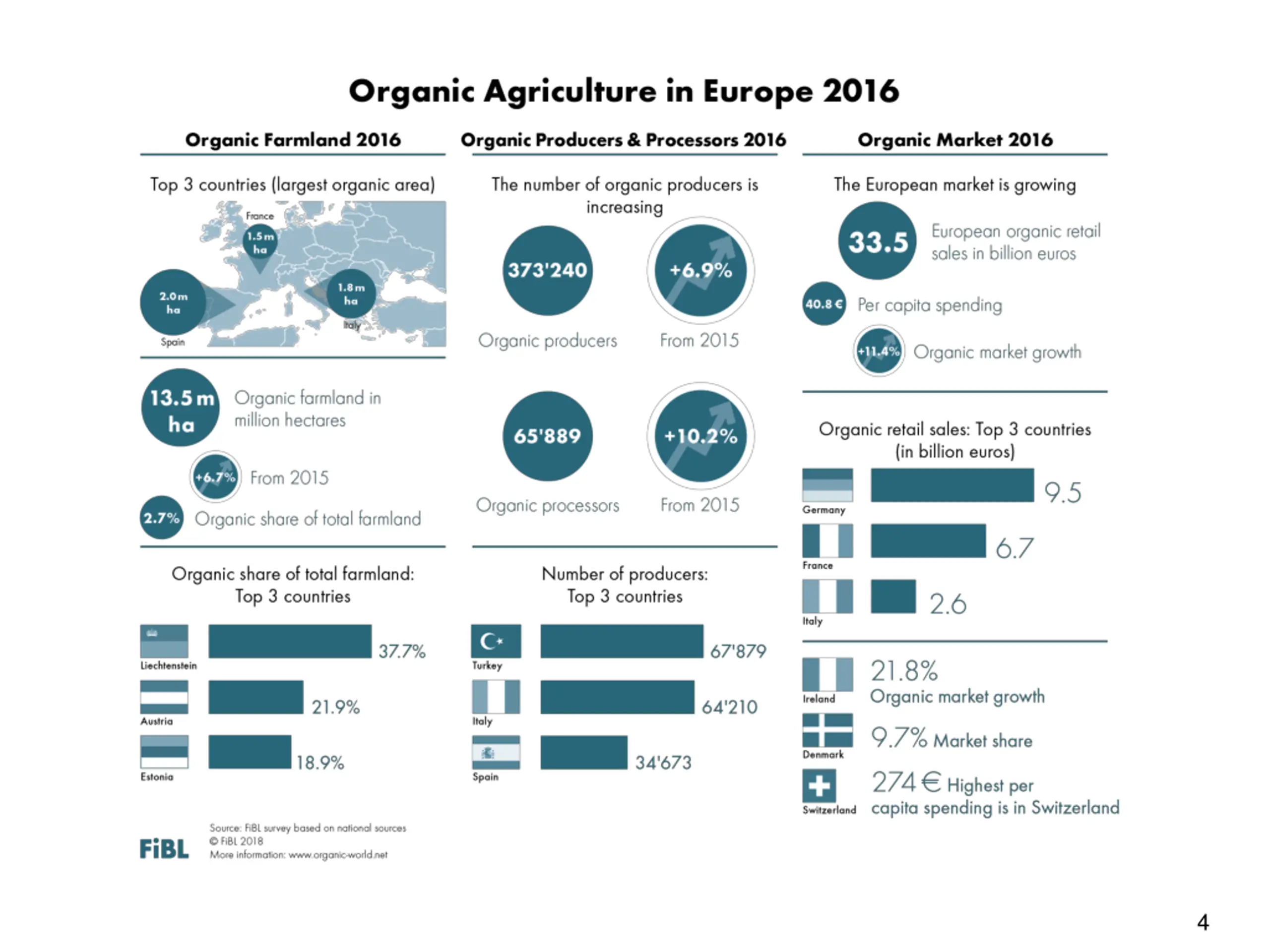 EUROPE: ORGANIC FARMLAND 2016 2.7% of Europe s farmland is organic (EU 6.7%) +73% in the decade 2007-2016 Europe 13.5 Million ha Spain 2.02 Million ha Half of Europe s organic farmland is in 4 countries. The country with the largest area of organic farmland is in Spain, followed by Italy and France. Nine countries have 10% or more of their agricultural land under organic management. In 2016, almost 0.85 million hectares more were reported compared with 2015. 16 Spain Liechtenstein 5 14 Spain Liechtenstein 12 Others Million hectares Austria Italy 4 Austria 10 Italy Estonia France 8 3 Estonia 6 France Sweden Germany 2 4 Sweden Germany 2 Italy Austria 1 Italy 0 1985 1995 2005 2015 0% Percentage 20% 40% 0.0 Million hectares 0.5 1.0 1.5 2.0 Distribution of organic agricultural land by country 2016 Top 5 countries with the largest areas of organic agricultural land 2016 Top 5 countries , where more than 10 percent of the farmland is organic 2016 Growth of the organic agricultural land 1985 2016 Source: FiBL survey 2018 www.organic-world.net