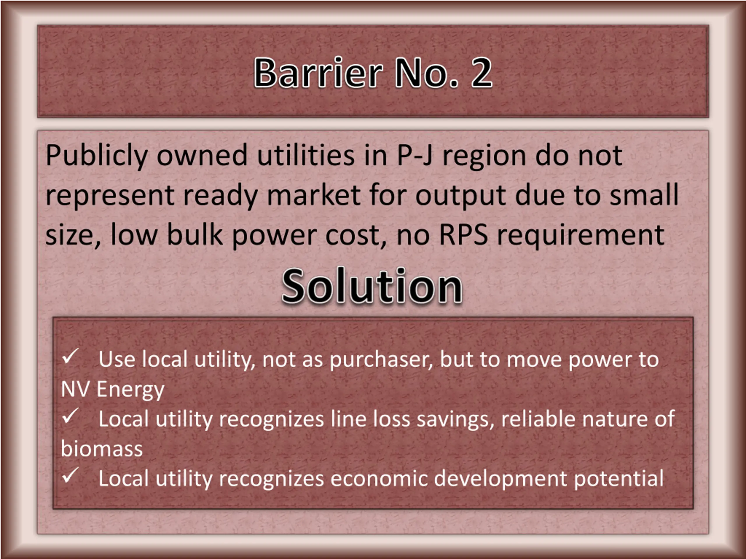 Barrier No. 2 Publicly owned utilities in P-J region do not represent ready market for output due to small size, low bulk power cost, no RPS requirement Use local utility, not as purchaser, but to move power to NV Energy Local utility recognizes line loss savings, reliable nature of biomass Local utility recognizes economic development potential
