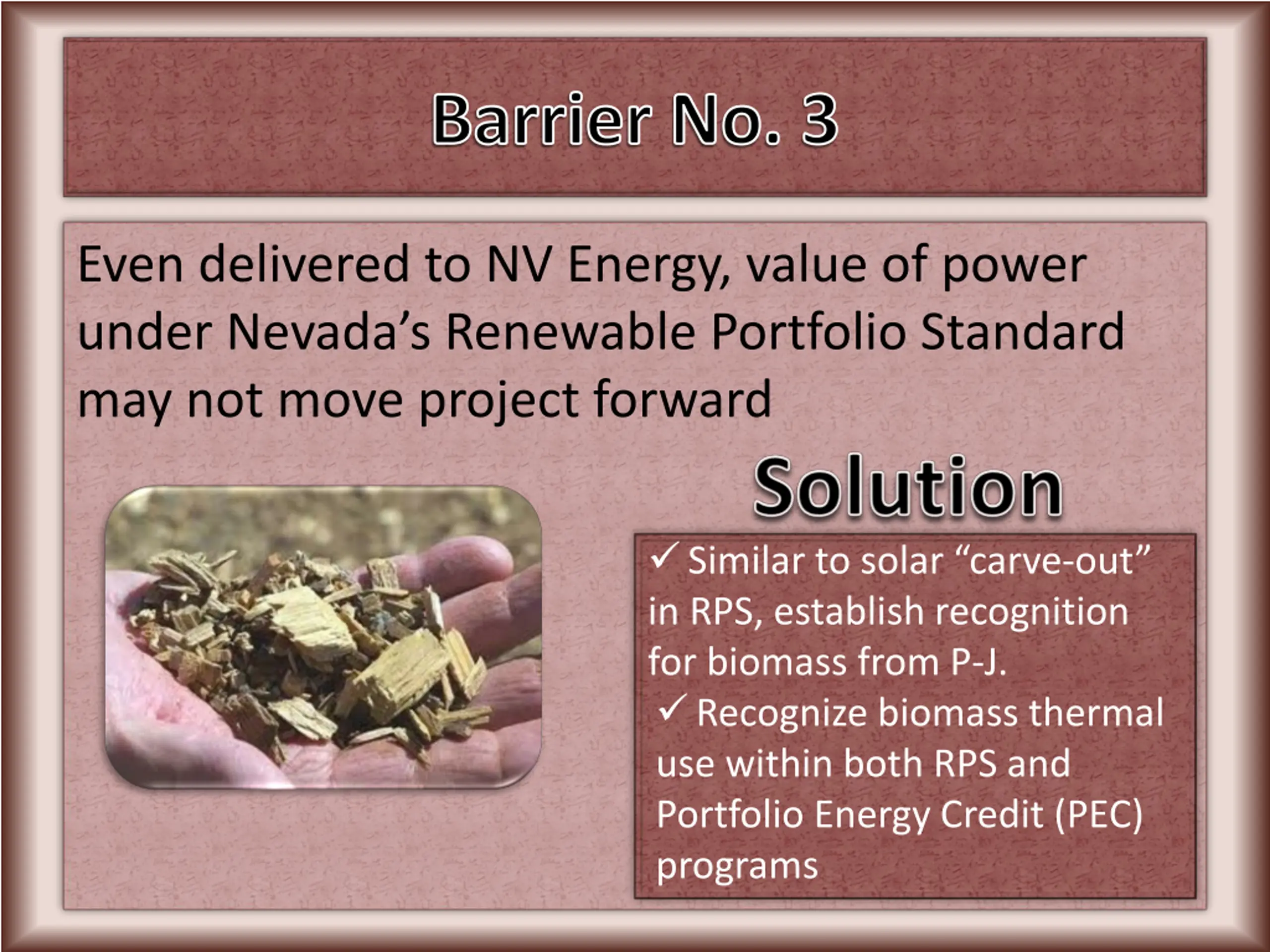 Barrier No. 3 Even delivered to NV Energy, value of power under Nevada s Renewable Portfolio Standard may not move project forward Similar to solar carve-out in RPS, establish recognition for biomass from P-J. Recognize biomass thermal use within both RPS and Portfolio Energy Credit (PEC) programs