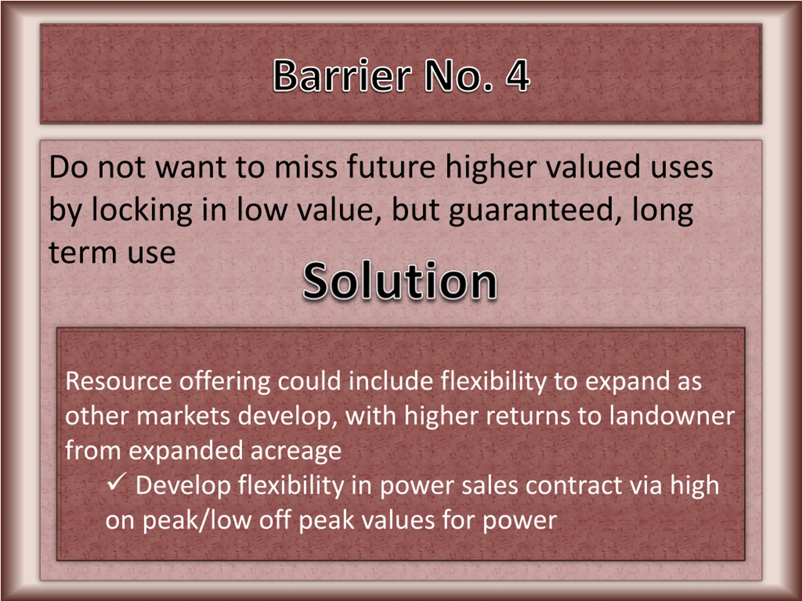 Barrier No. 4 Do not want to miss future higher valued uses by locking in low value, but guaranteed, long term use Resource offering could include flexibility to expand as other markets develop, with higher returns to landowner from expanded acreage Develop flexibility in power sales contract via high on peak/low off peak values for power