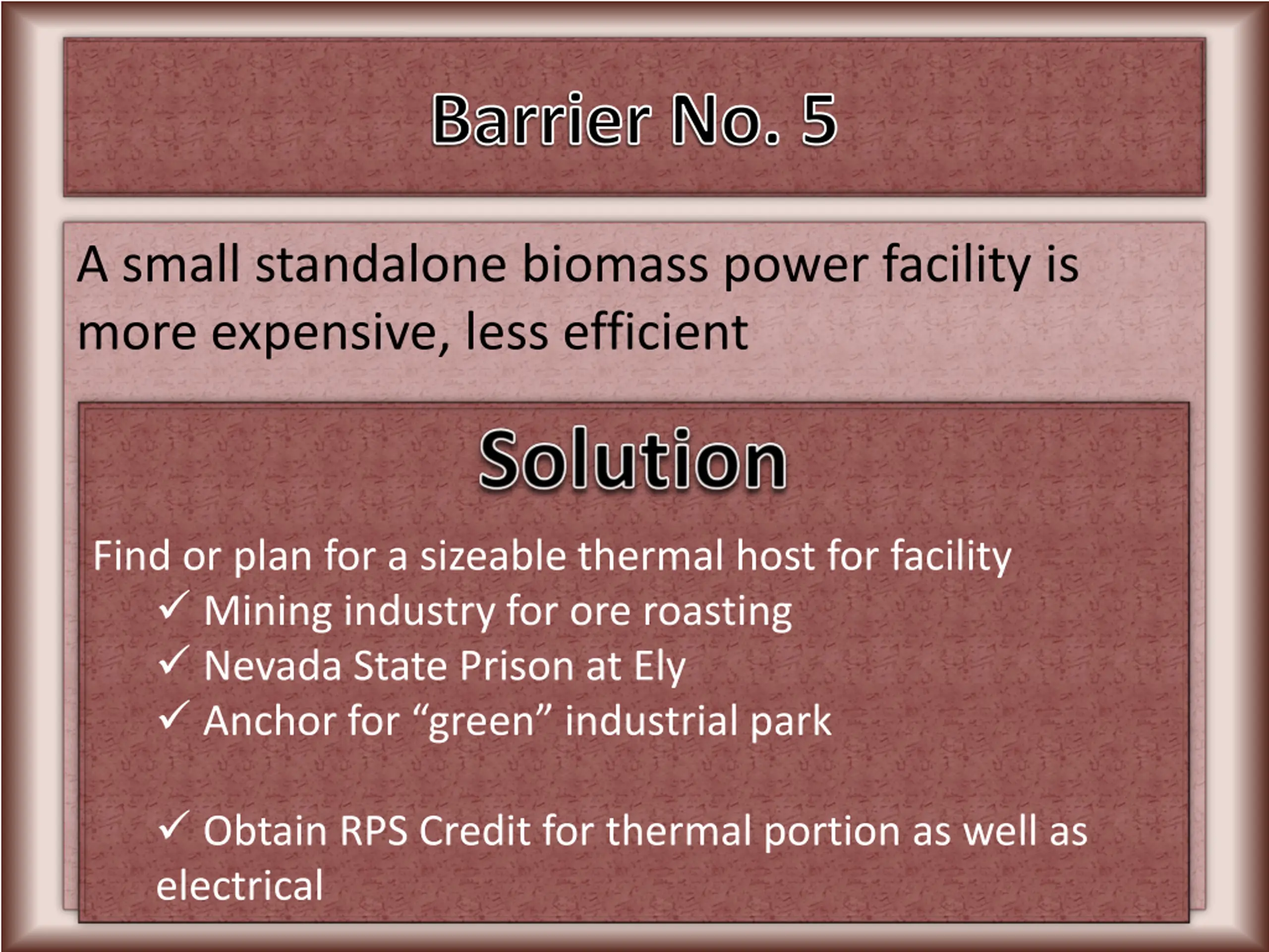 Barrier No. 5 A small standalone biomass power facility is more expensive, less efficient Find or plan for a sizeable thermal host for facility Mining industry for ore roasting Nevada State Prison at Ely Anchor for green industrial park Obtain RPS Credit for thermal portion as well as electrical