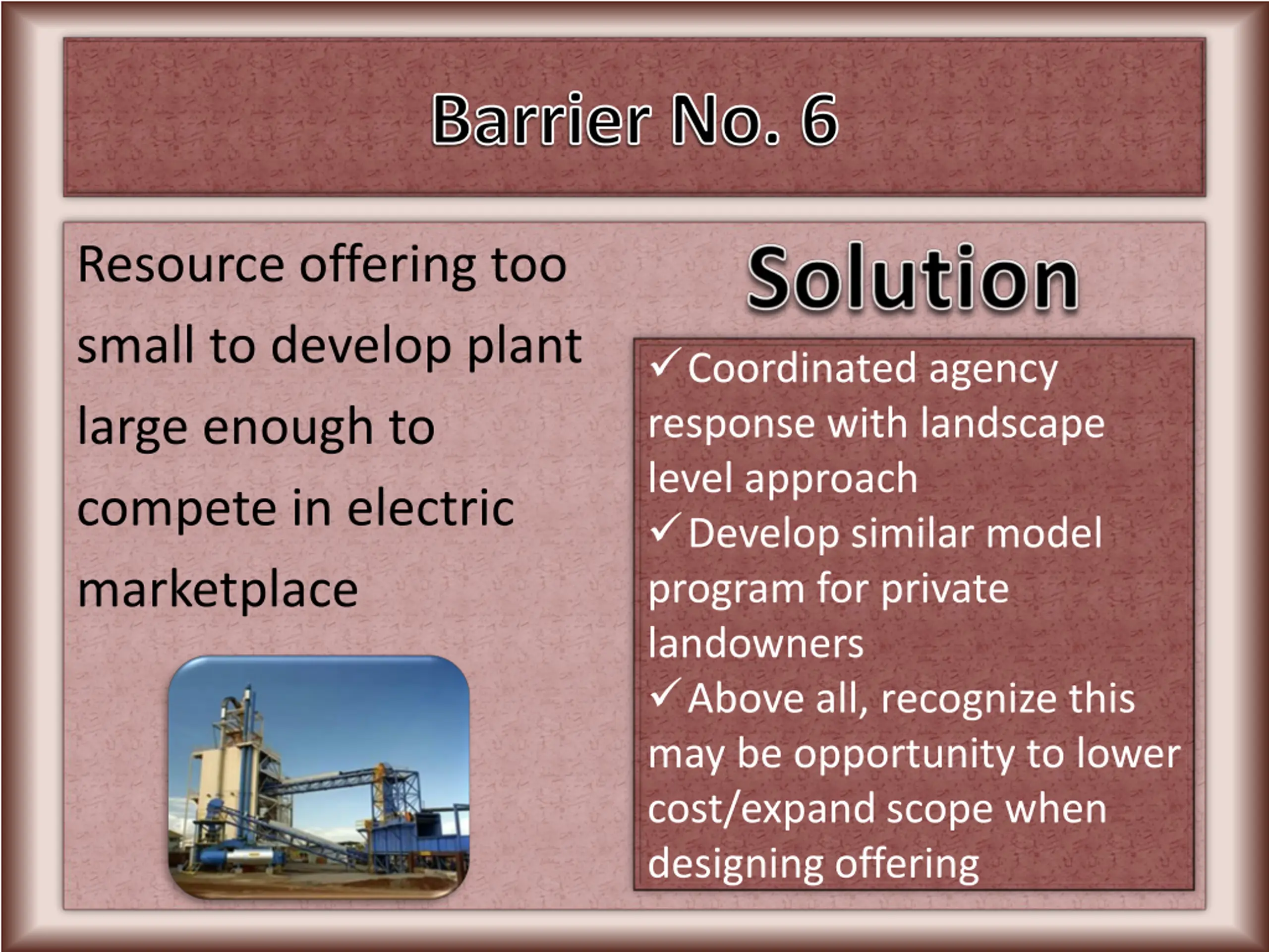 Barrier No. 6 Resource offering too small to develop plant large enough to compete in electric marketplace Coordinated agency response with landscape level approach Develop similar model program for private landowners Above all, recognize this may be opportunity to lower cost/expand scope when designing offering