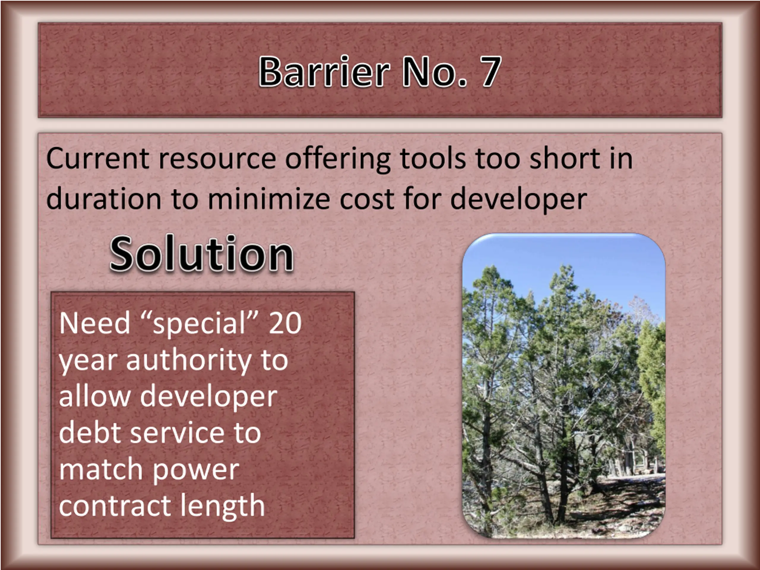 Barrier No. 7 Current resource offering tools too short in duration to minimize cost for developer Need special 20 year authority to allow developer debt service to match power contract length